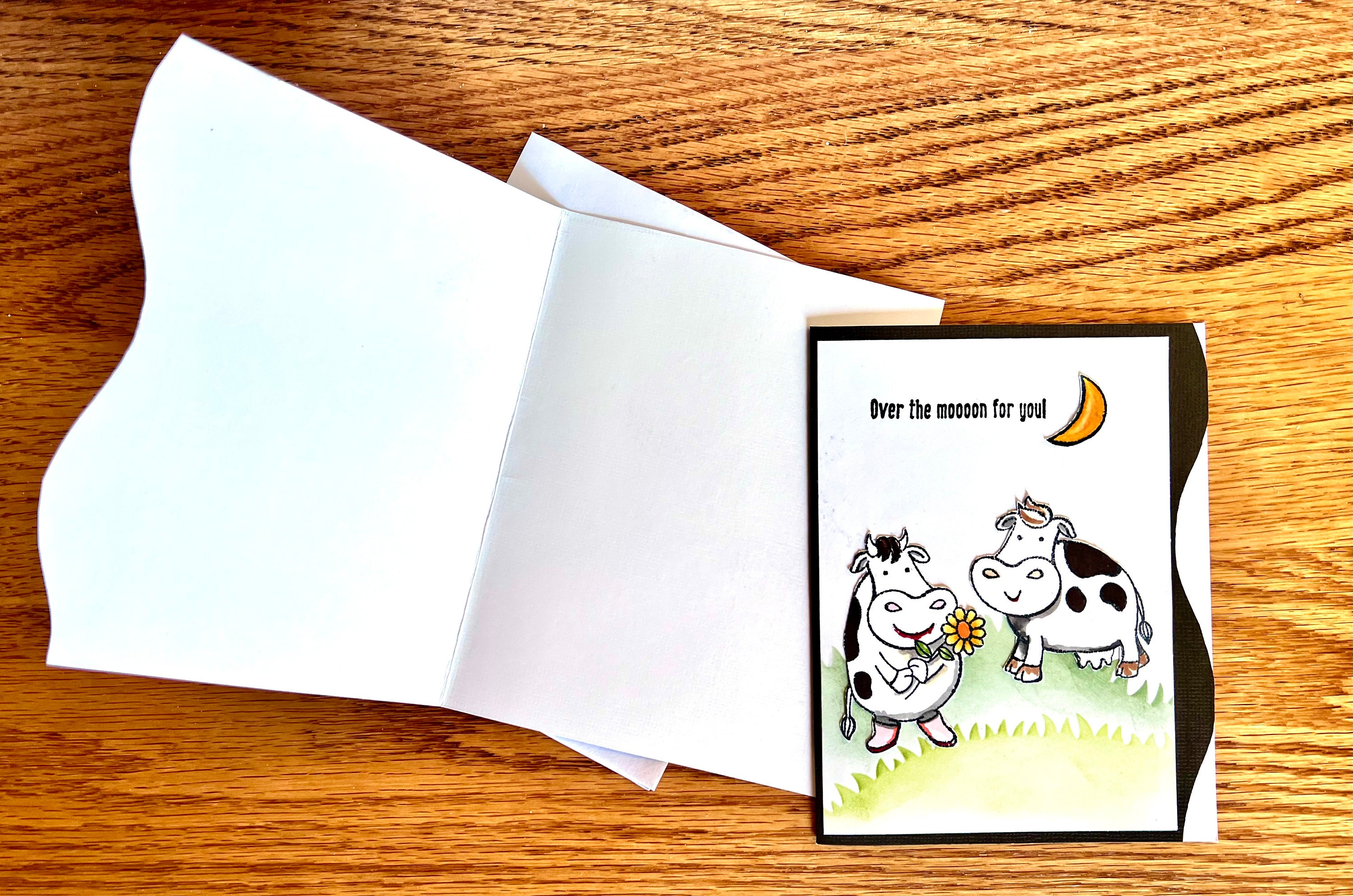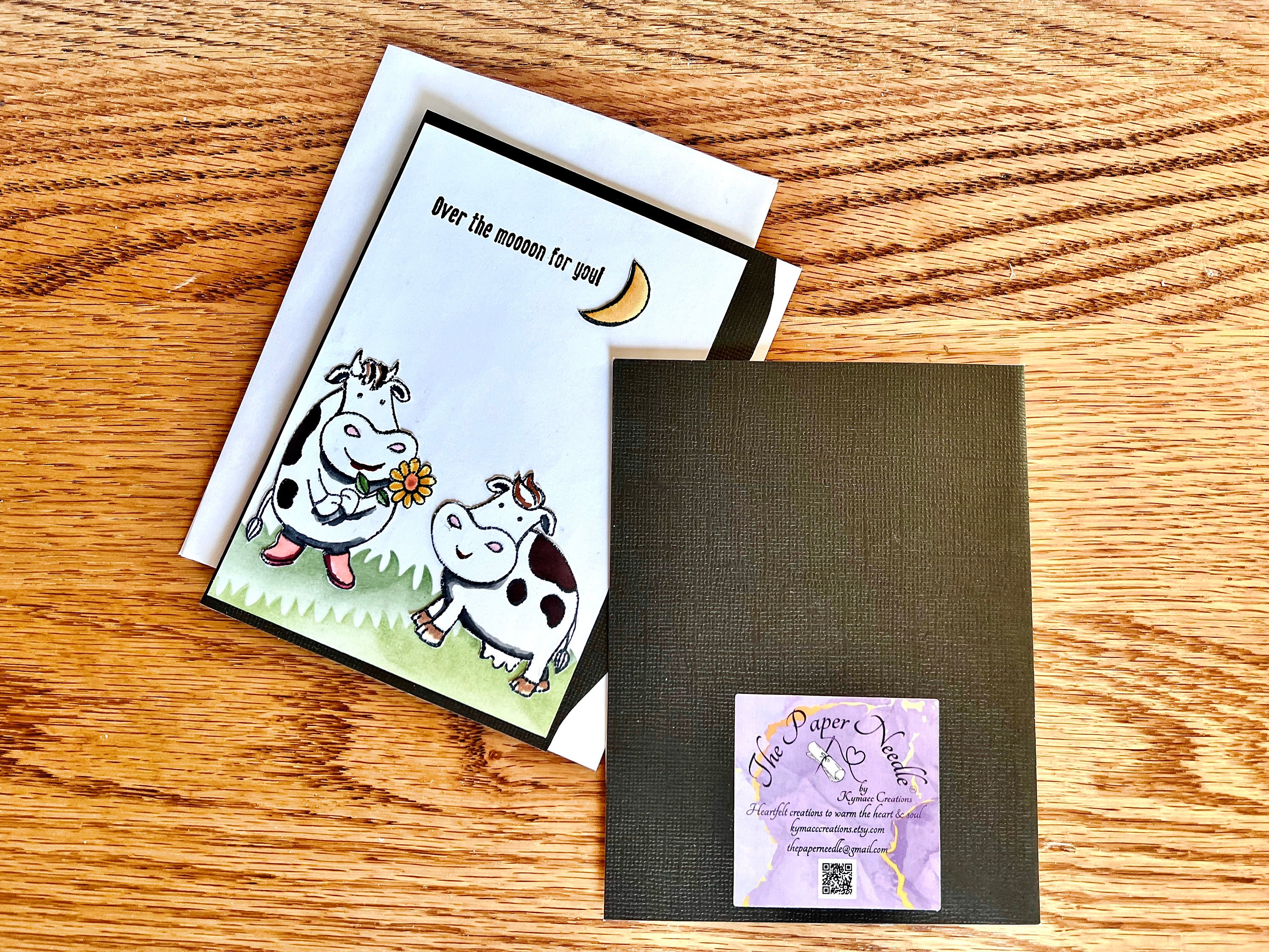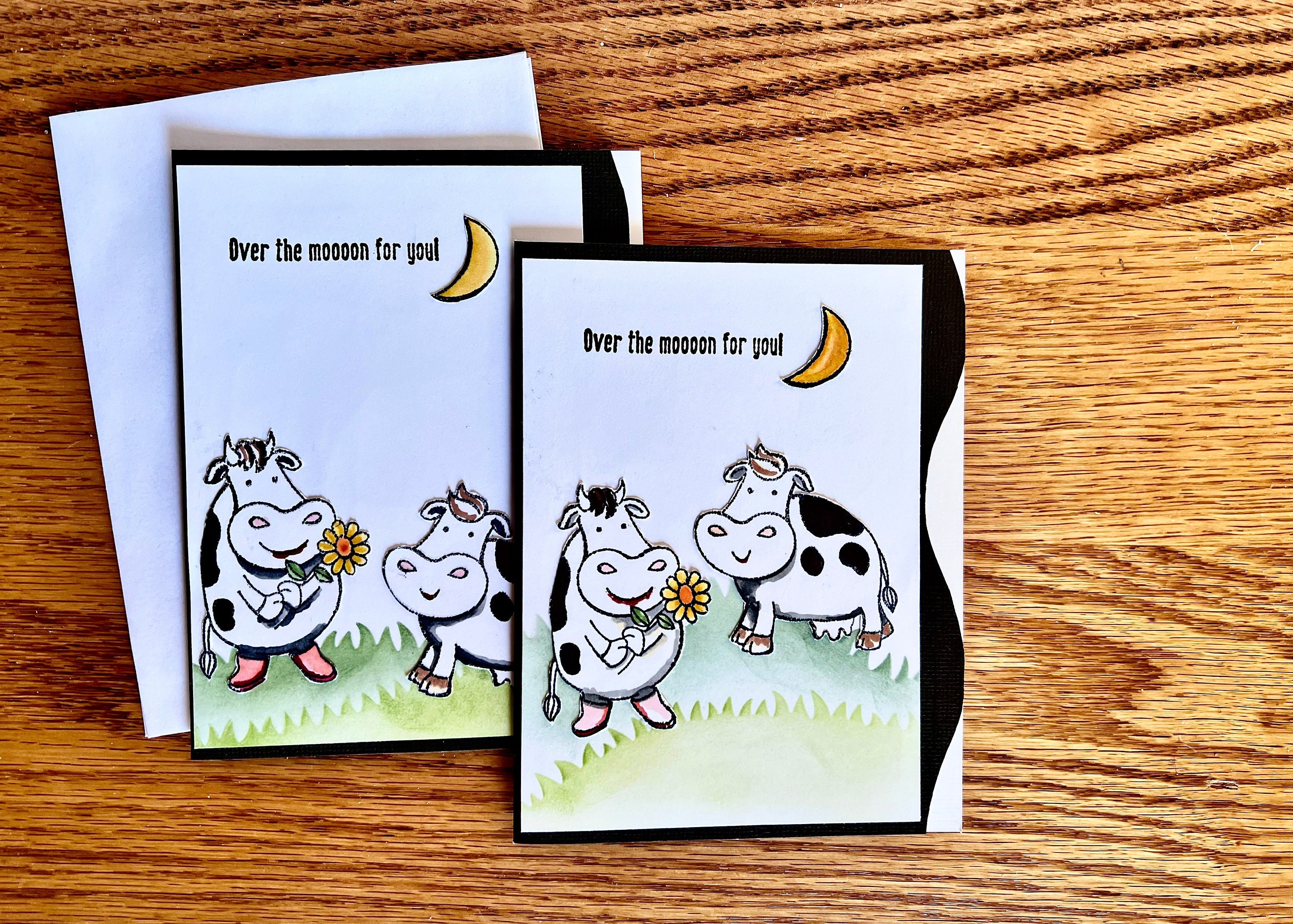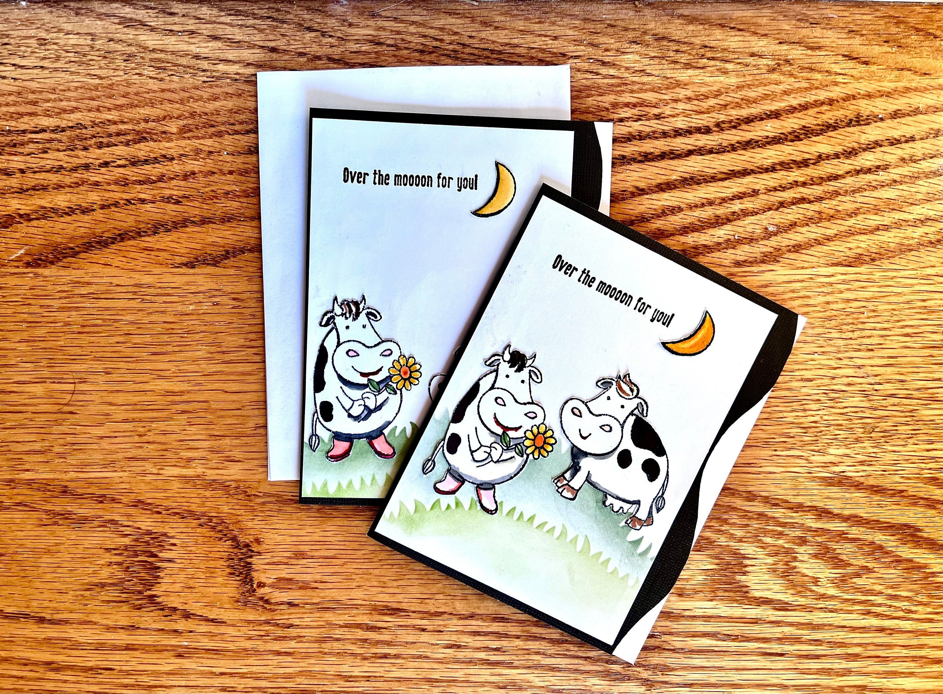 Each card is uniquely designed, which means each one will vary slightly in its creation. The cows and moon are hand stamped, colored, cut and adhered to the card. The card fronts are hand painted with archival ink using card stencils in various shades of green. This card is blank inside to write a touching message for Valentine's Day, Anniversary, Proposal, Wedding, or as a simple love note just because.