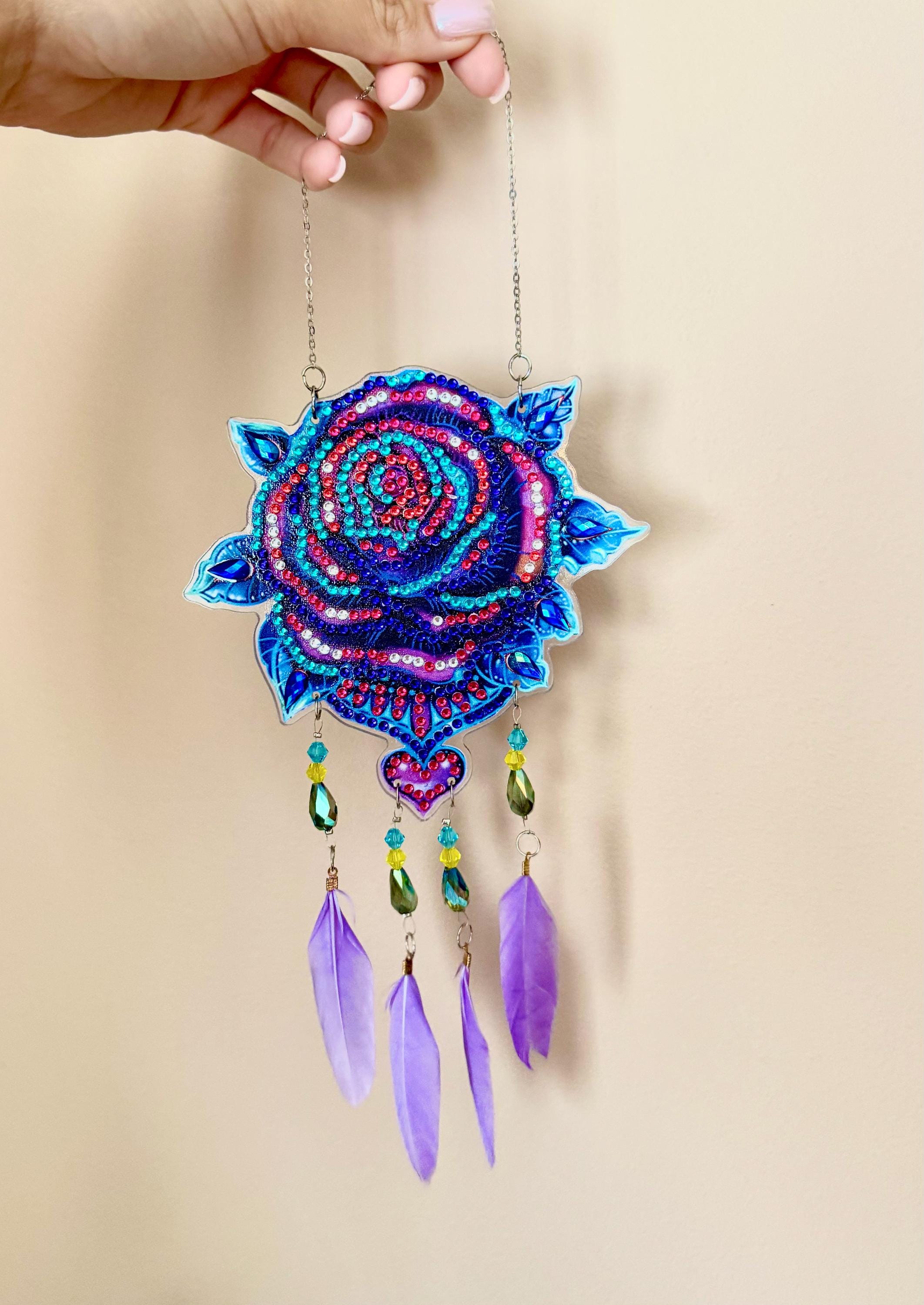 Diamond Art Rose Dreamcatcher: Beaded Boho Suncatcher with Crystals & Feathers