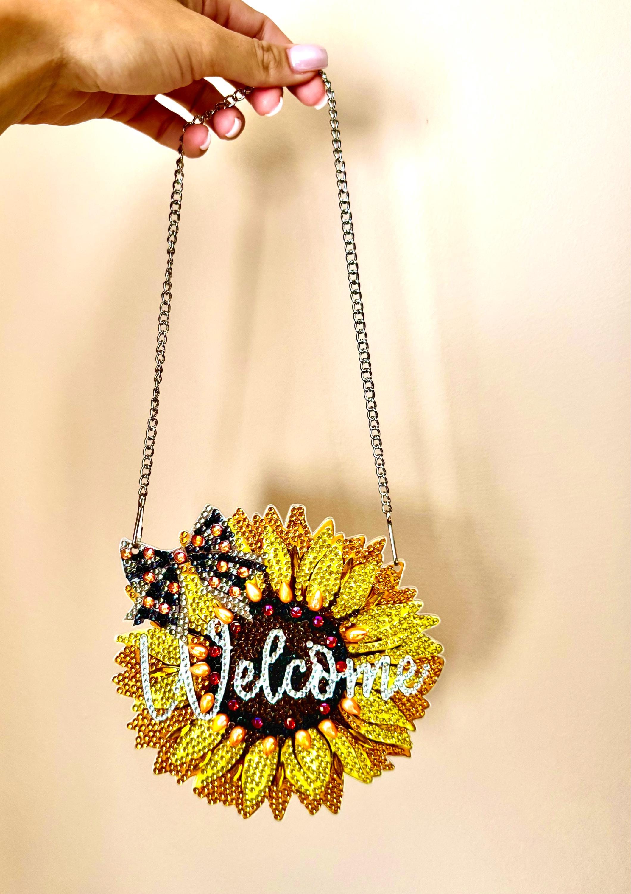 This Hand Finished Diamond Painting Sunflower Welcome Sign is a bright and cheerful addition to any entryway, porch, or interior space. Carefully crafted with shimmering resin rhinestones and a detailed sunflower design, this finished piece adds warmth, texture, and charm to your home décor.