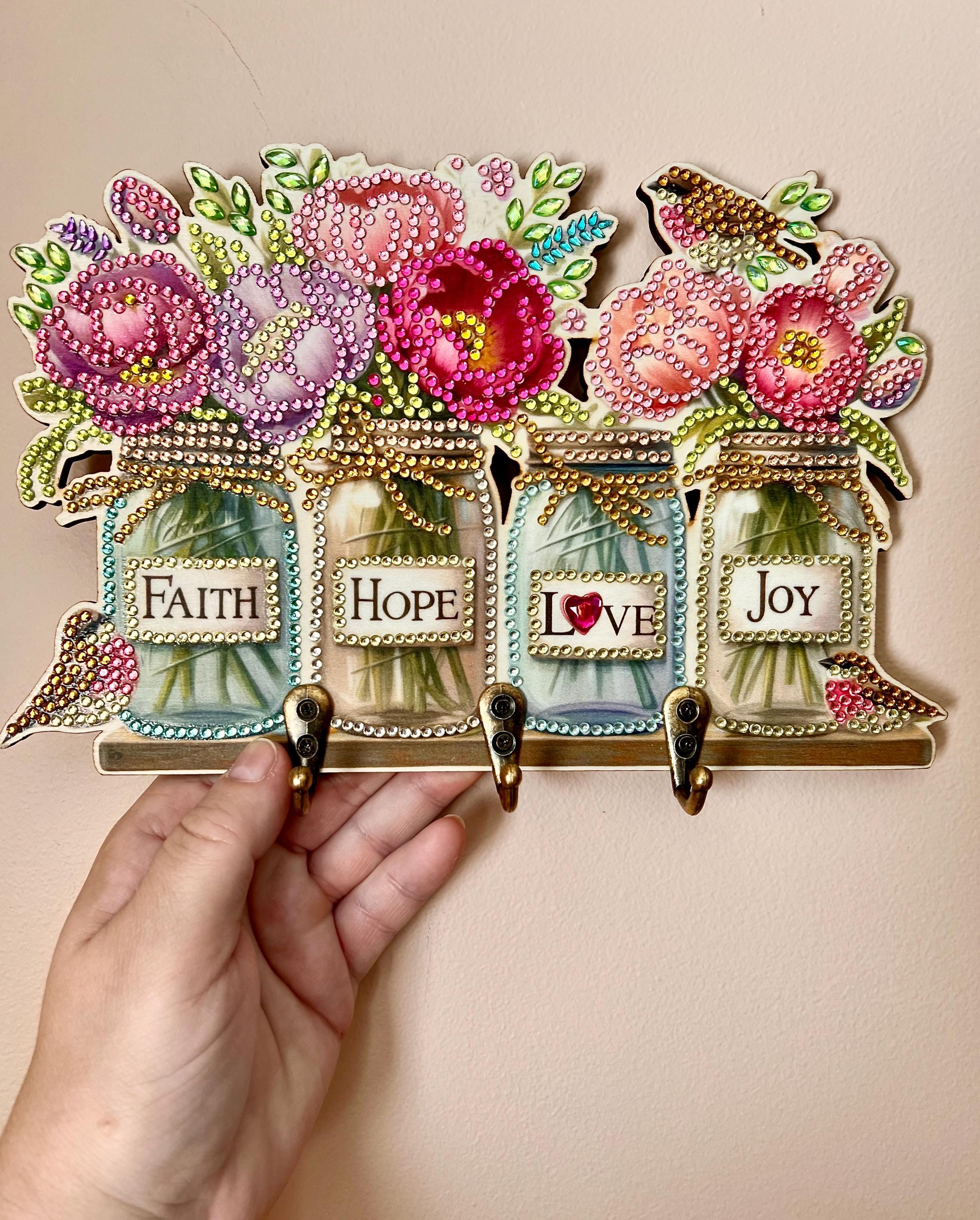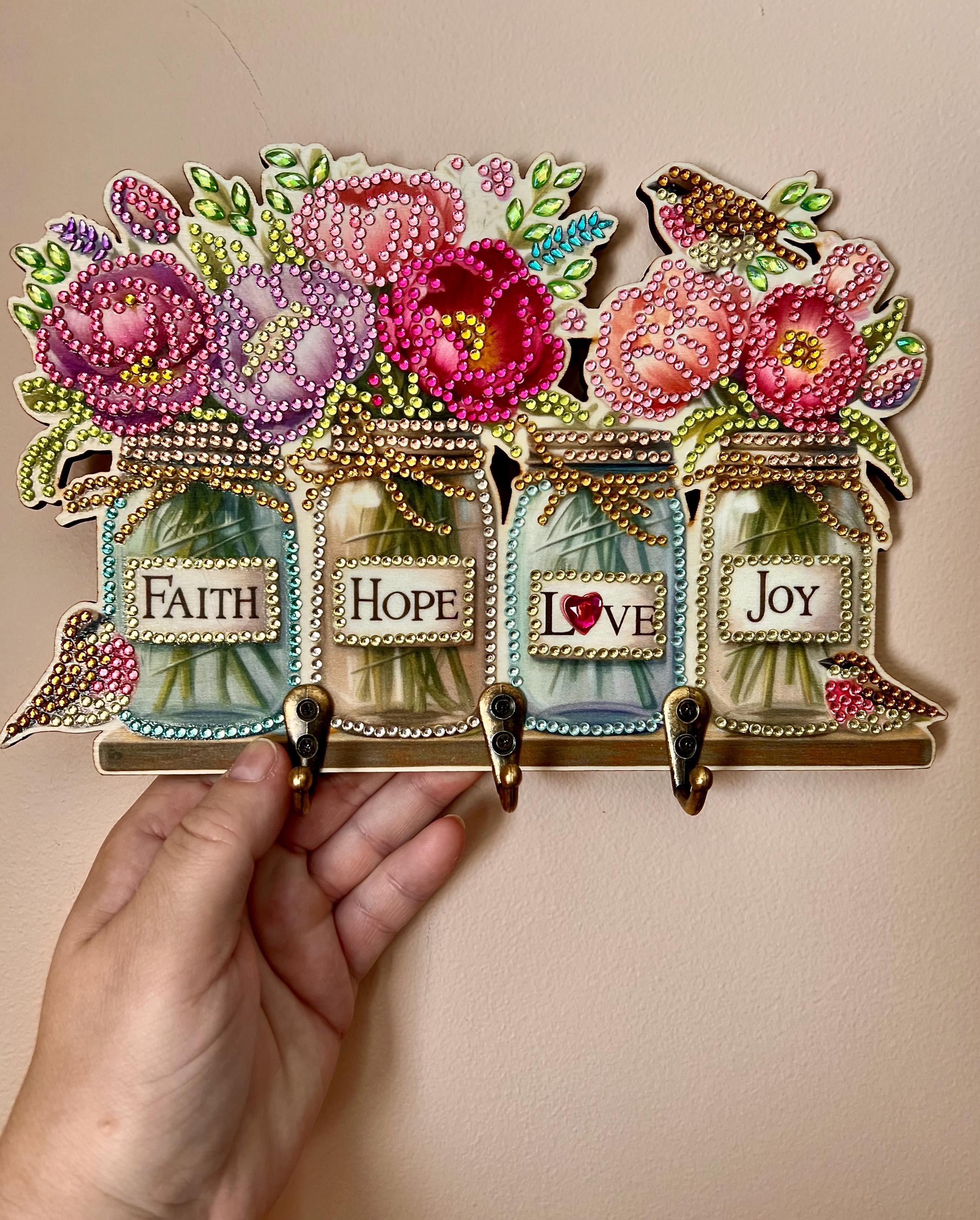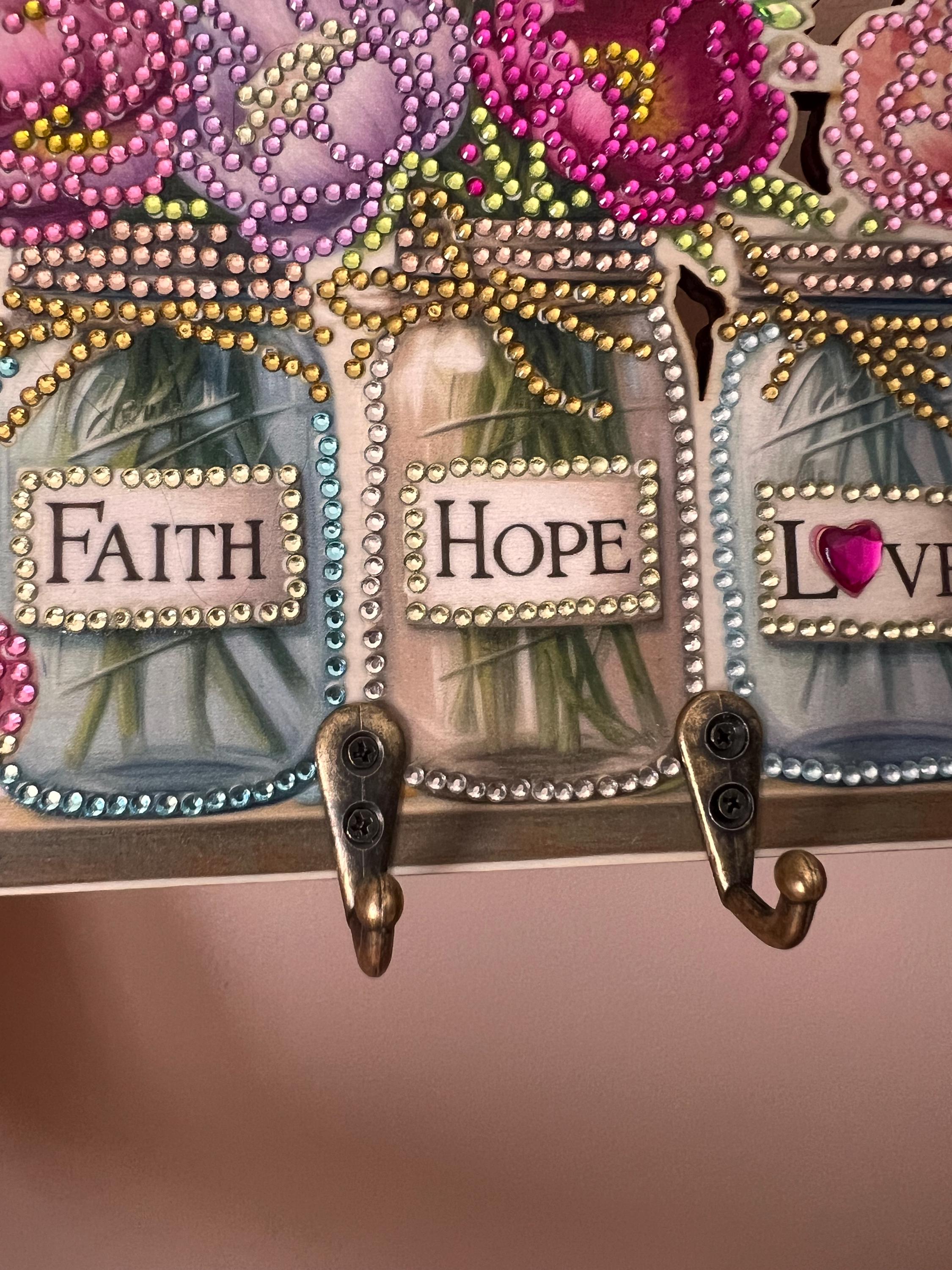 ✨ Bring sparkle and inspiration to your walls with this diamond-painted floral wall hook! Featuring mason jars filled with bright blooms labeled Faith, Hope, Love, and Joy, this piece is beautifully hand-beaded with colorful resin rhinestones and fully sealed for lasting shine and durability.