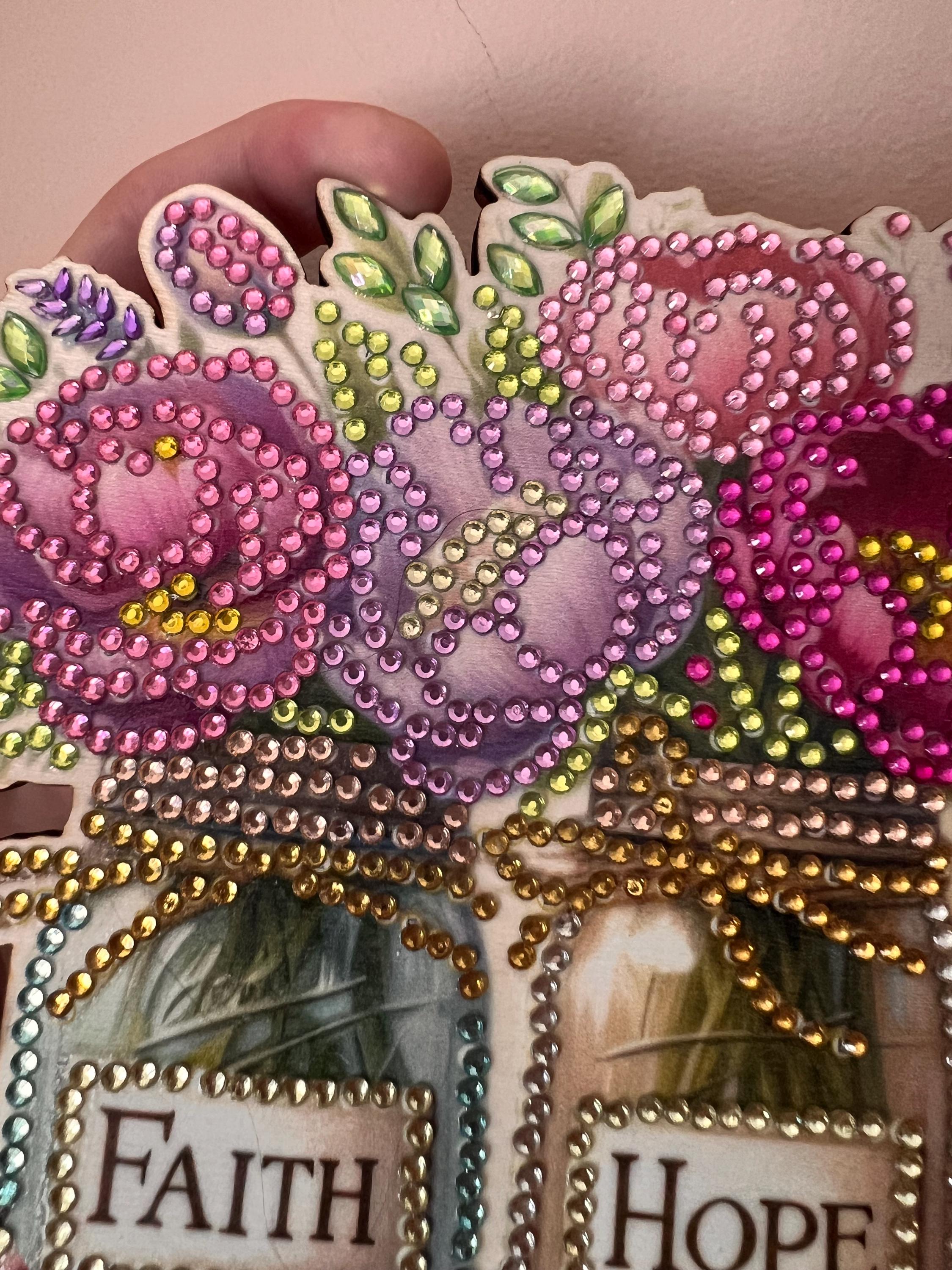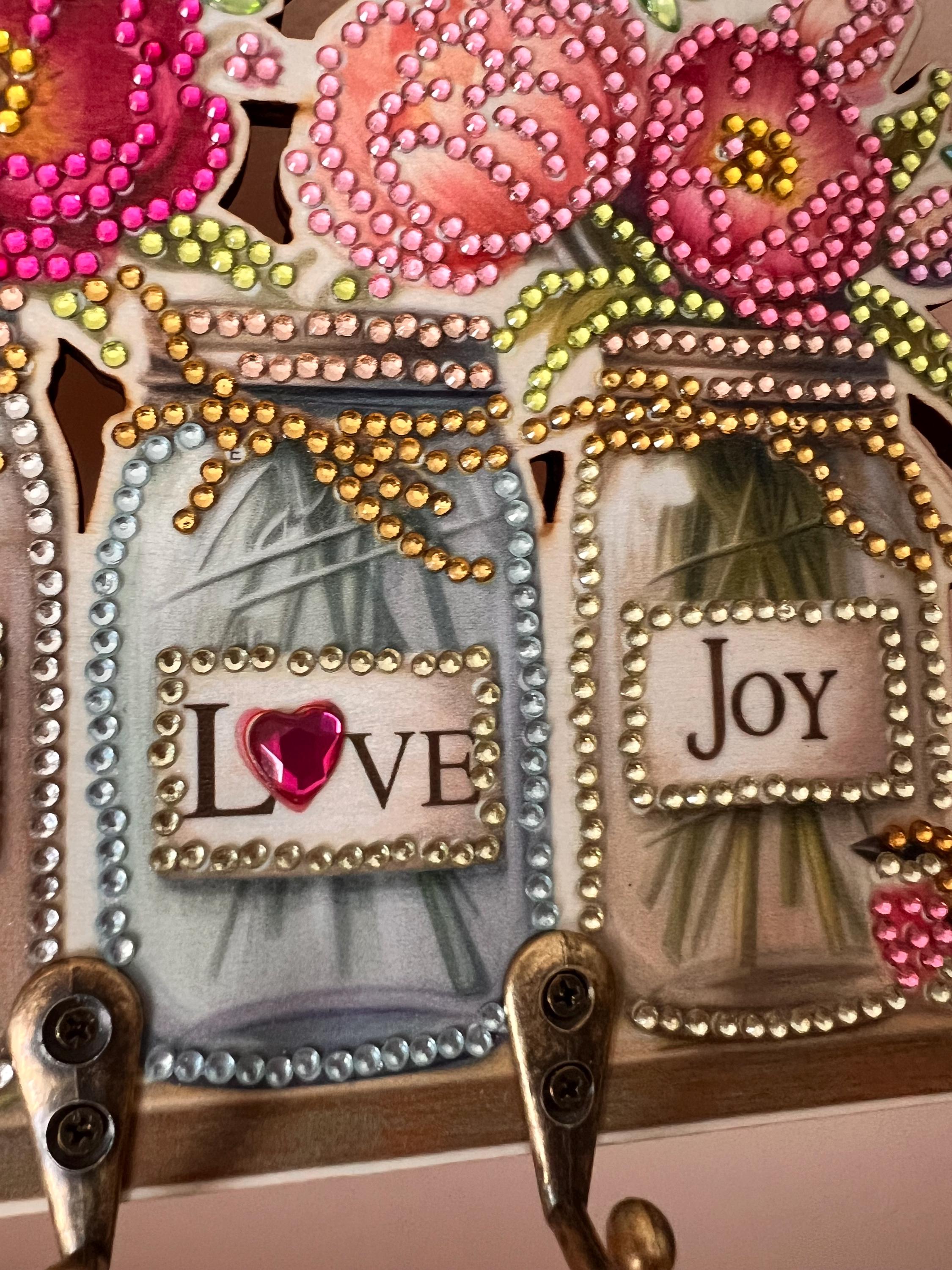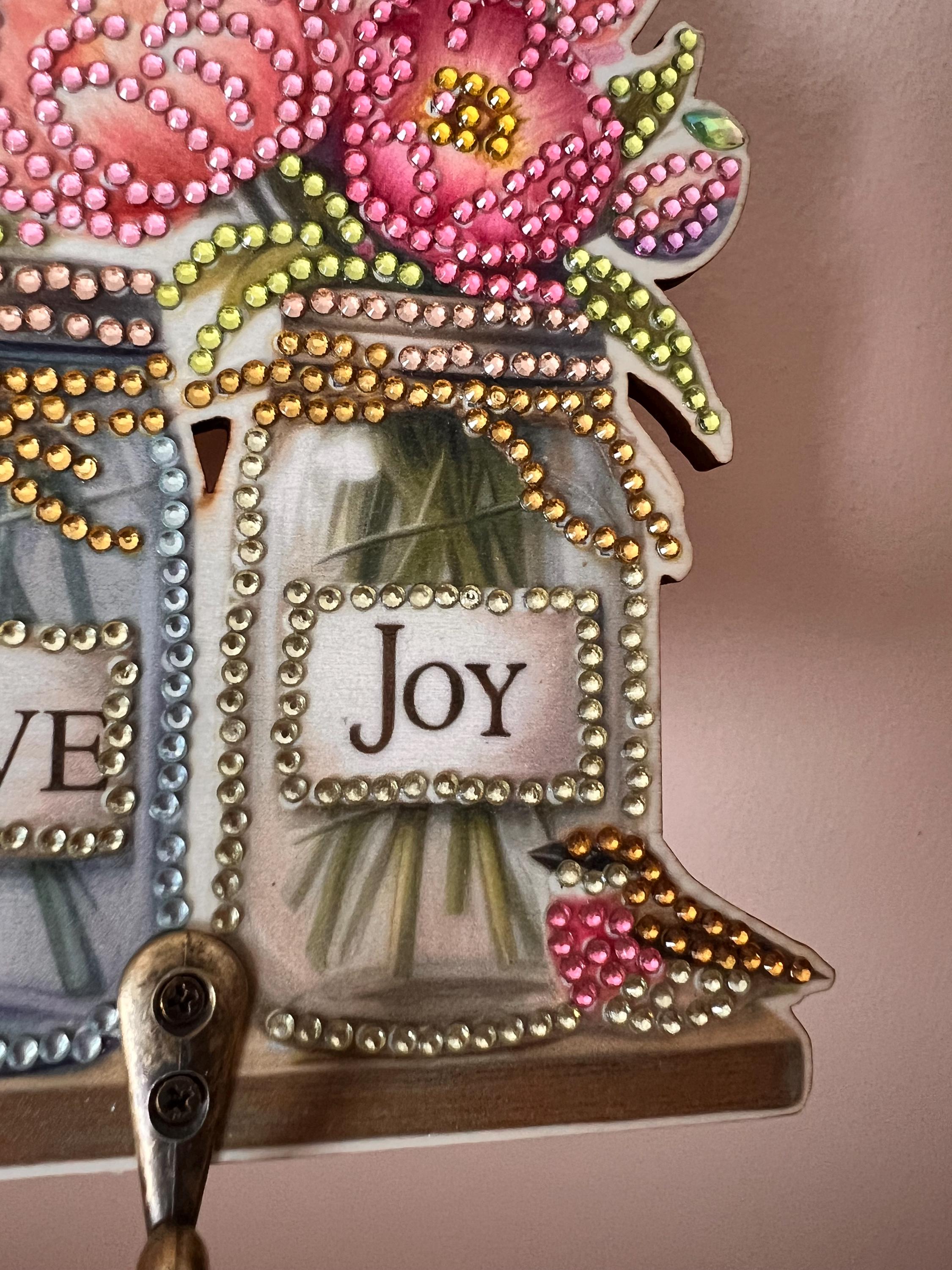 ✨ Bring sparkle and inspiration to your walls with this diamond-painted floral wall hook! Featuring mason jars filled with bright blooms labeled Faith, Hope, Love, and Joy, this piece is beautifully hand-beaded with colorful resin rhinestones and fully sealed for lasting shine and durability.