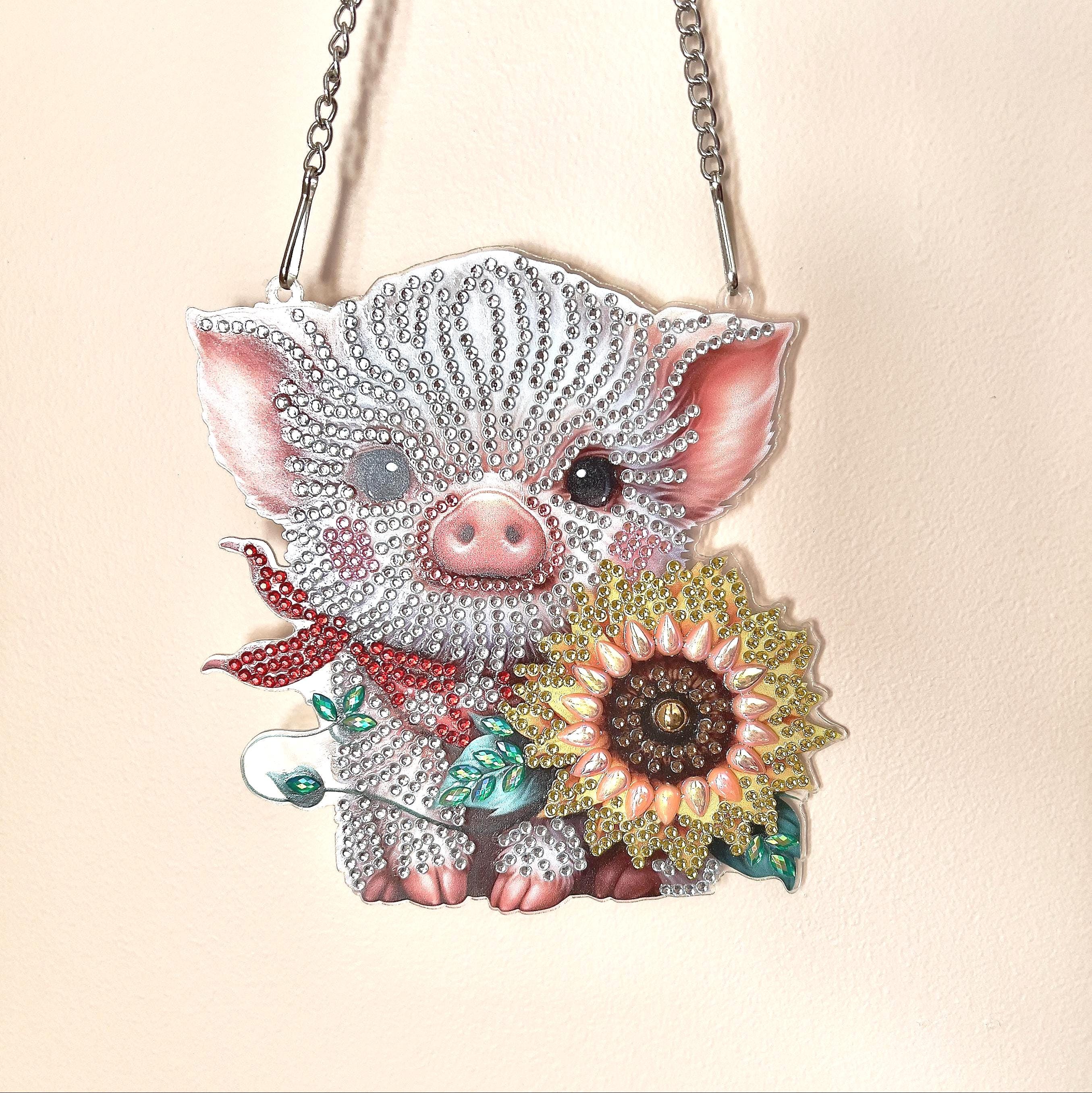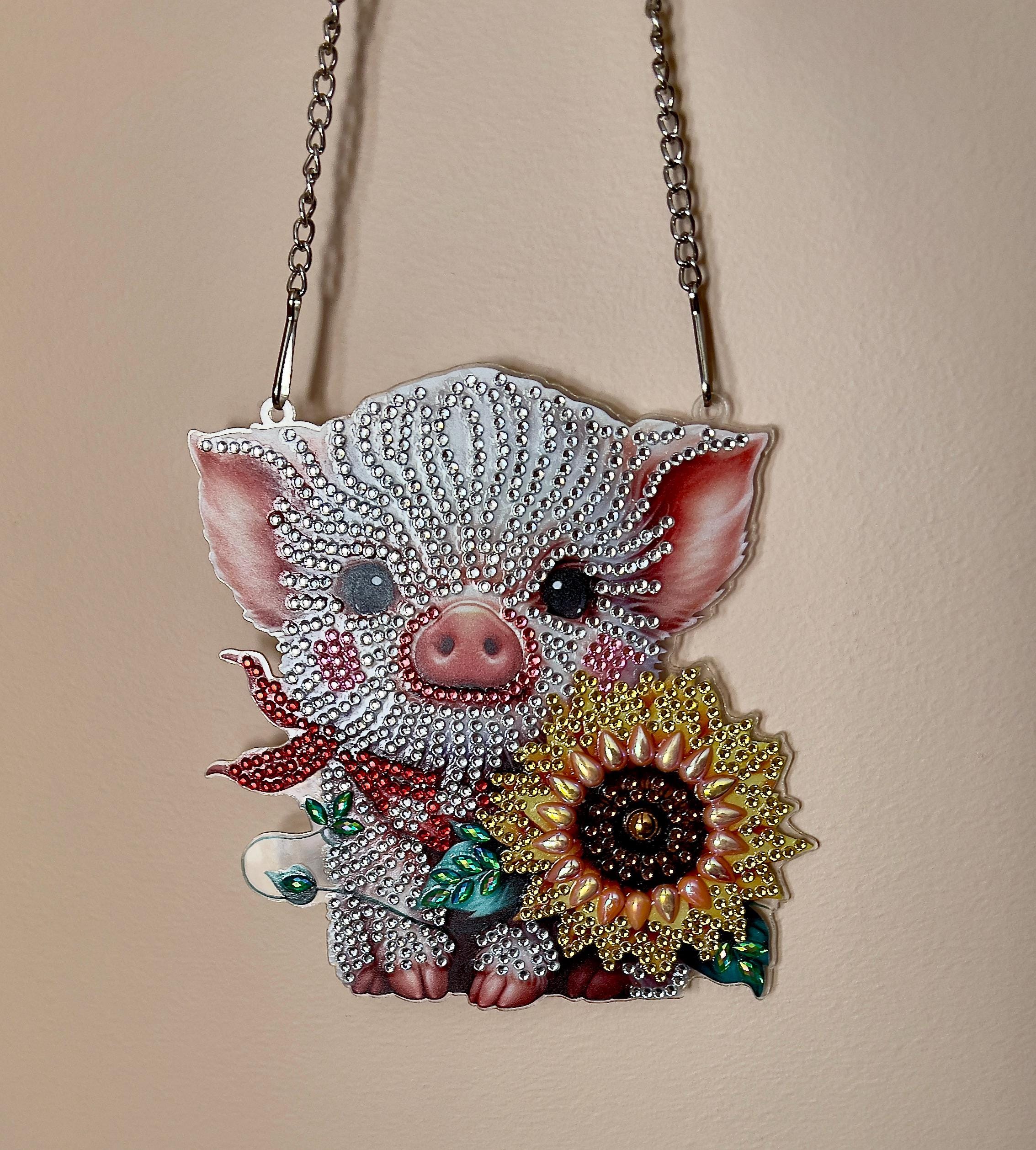 Hand Beaded Piglet Wall Hanging: Rhinestone Sunflower Decor, Diamond Painting Farm Animal Art,