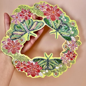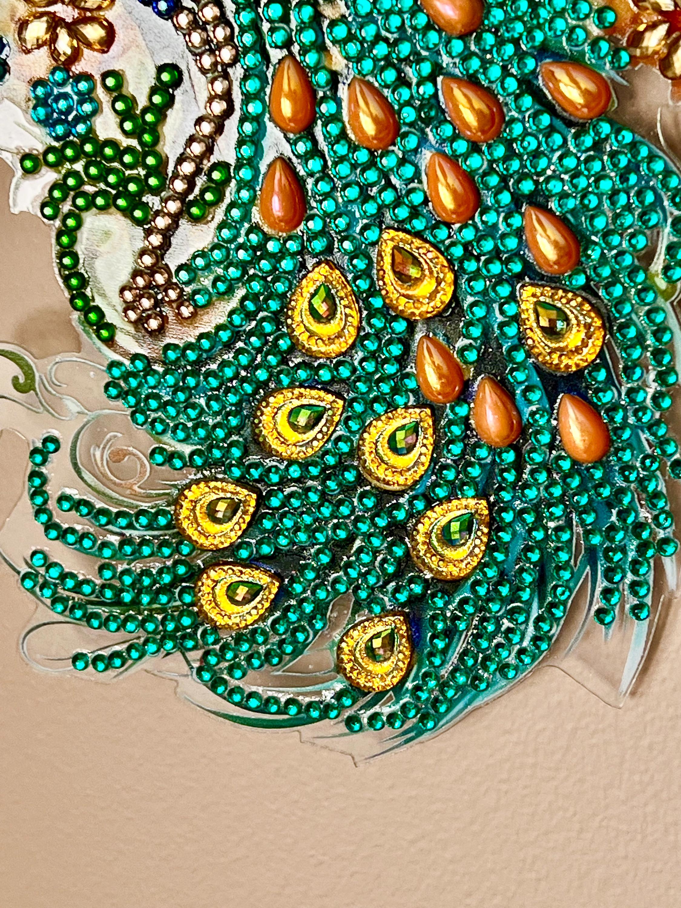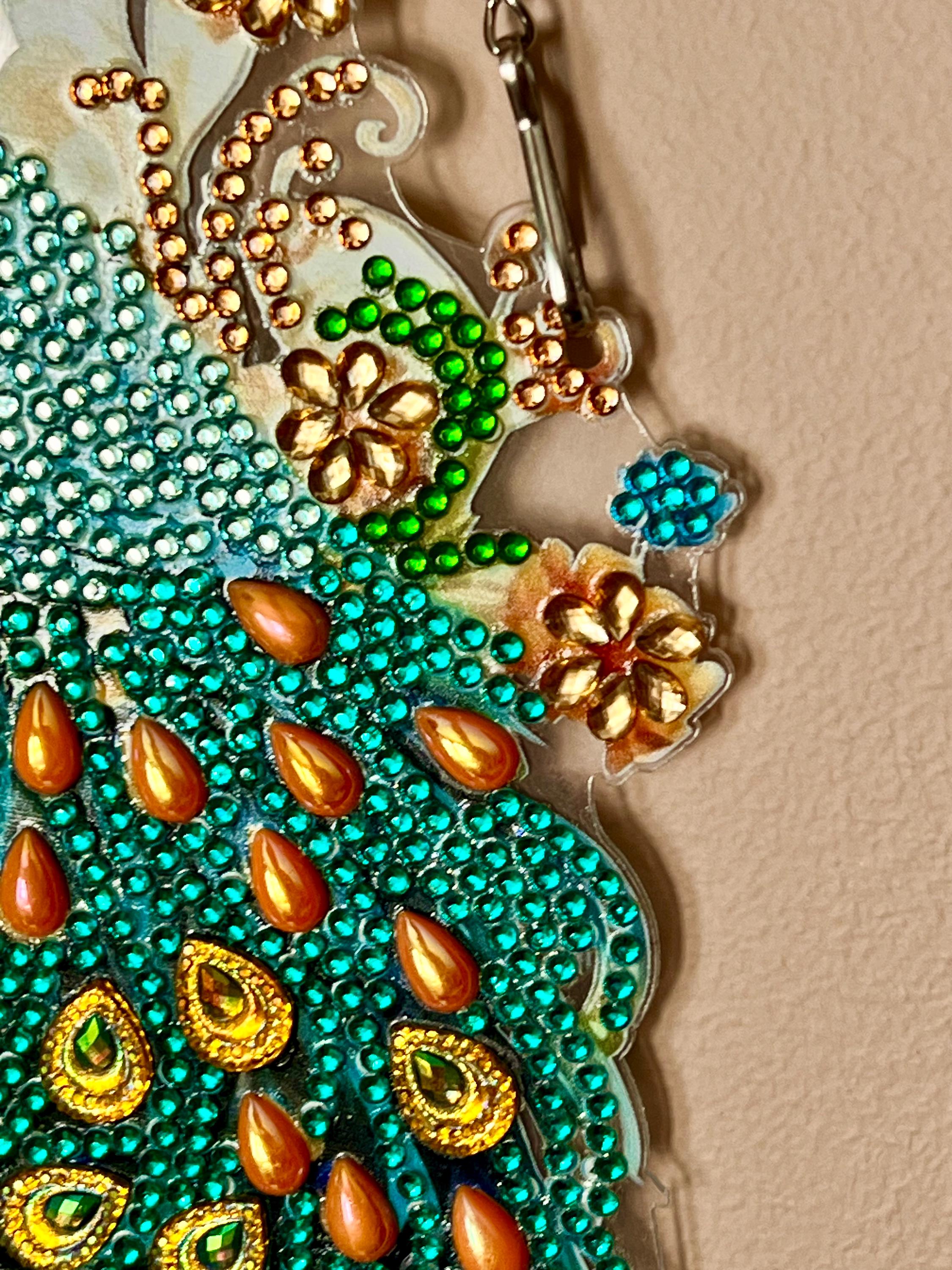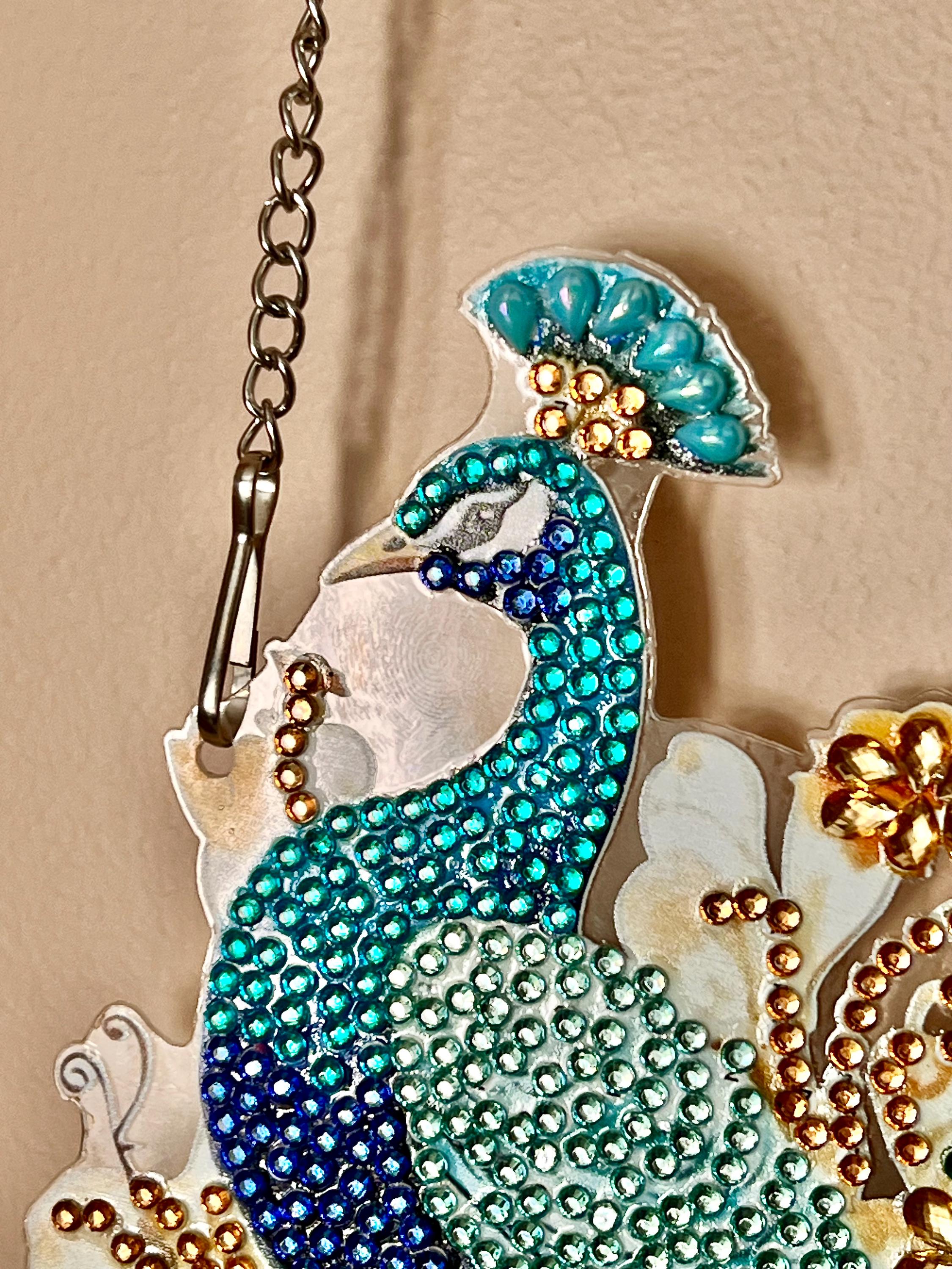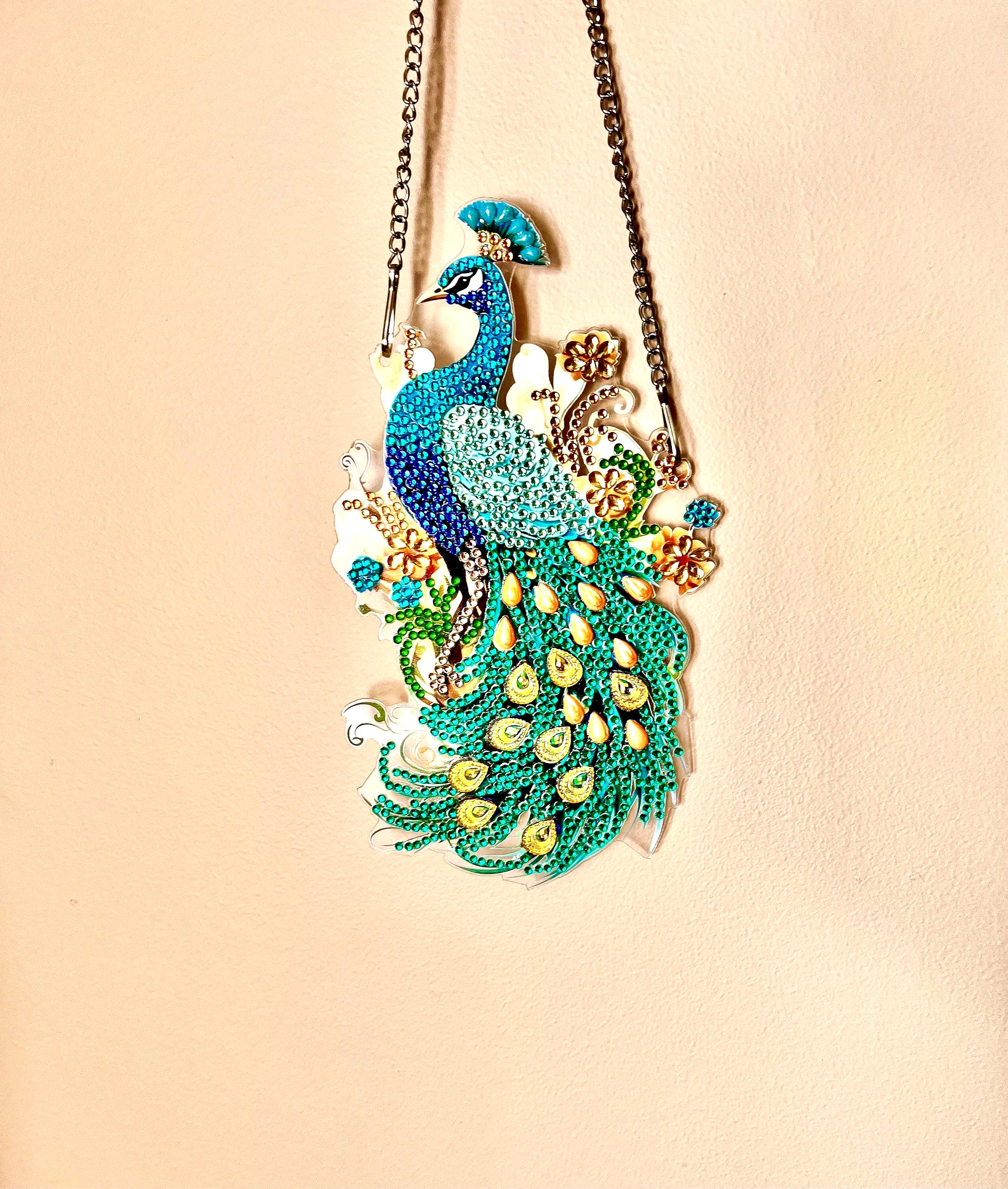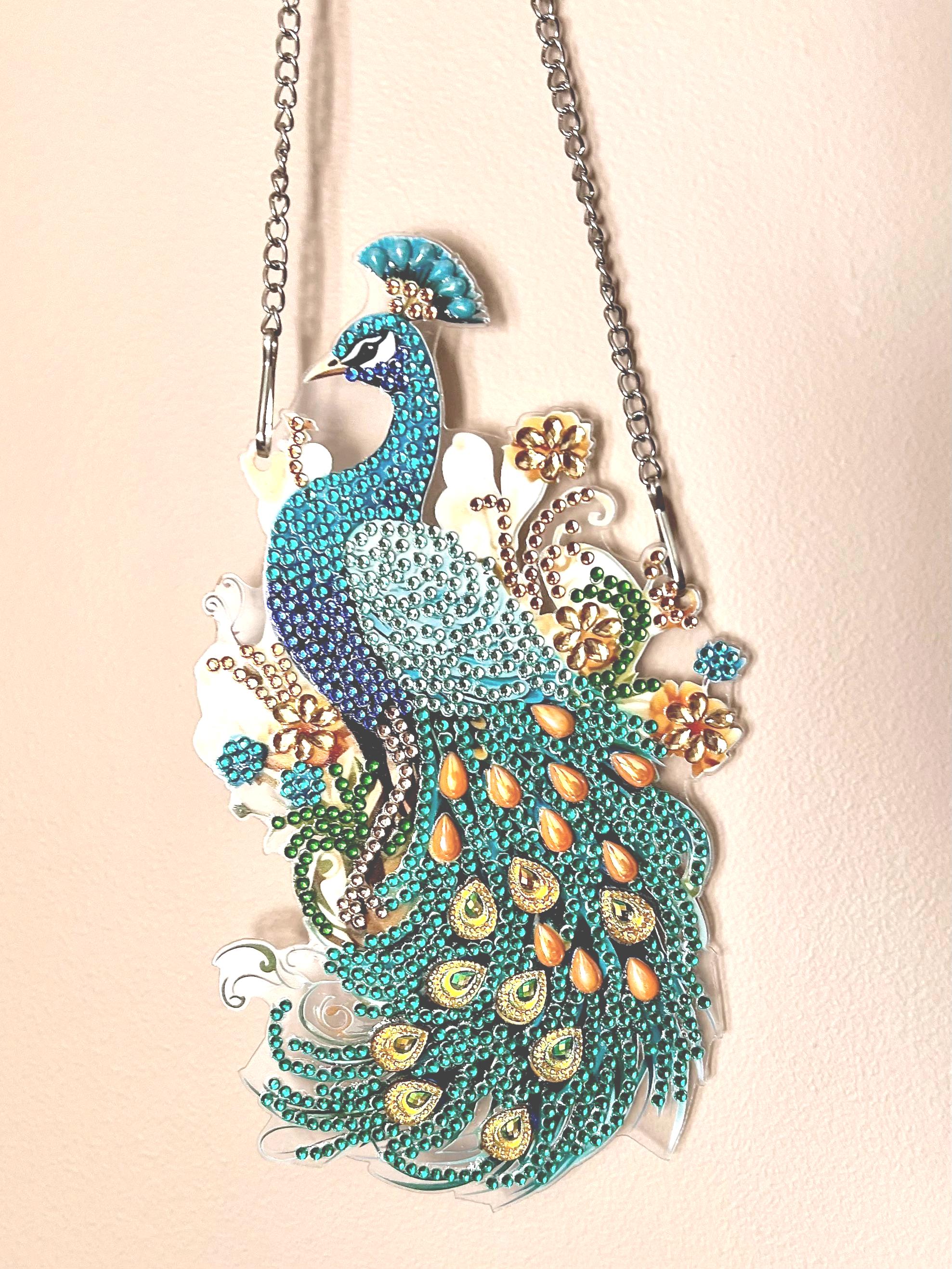 Add bold beauty and shimmer to your space with this diamond-painted peacock ornament! Featuring a regal blue and green peacock with a fully beaded tail, this handmade piece shines with rhinestones, teardrop gems, and floral accents. It’s a captivating addition to any room or window and makes a perfect gift for bird lovers or fans of glam, boho, or nature-inspired decor.