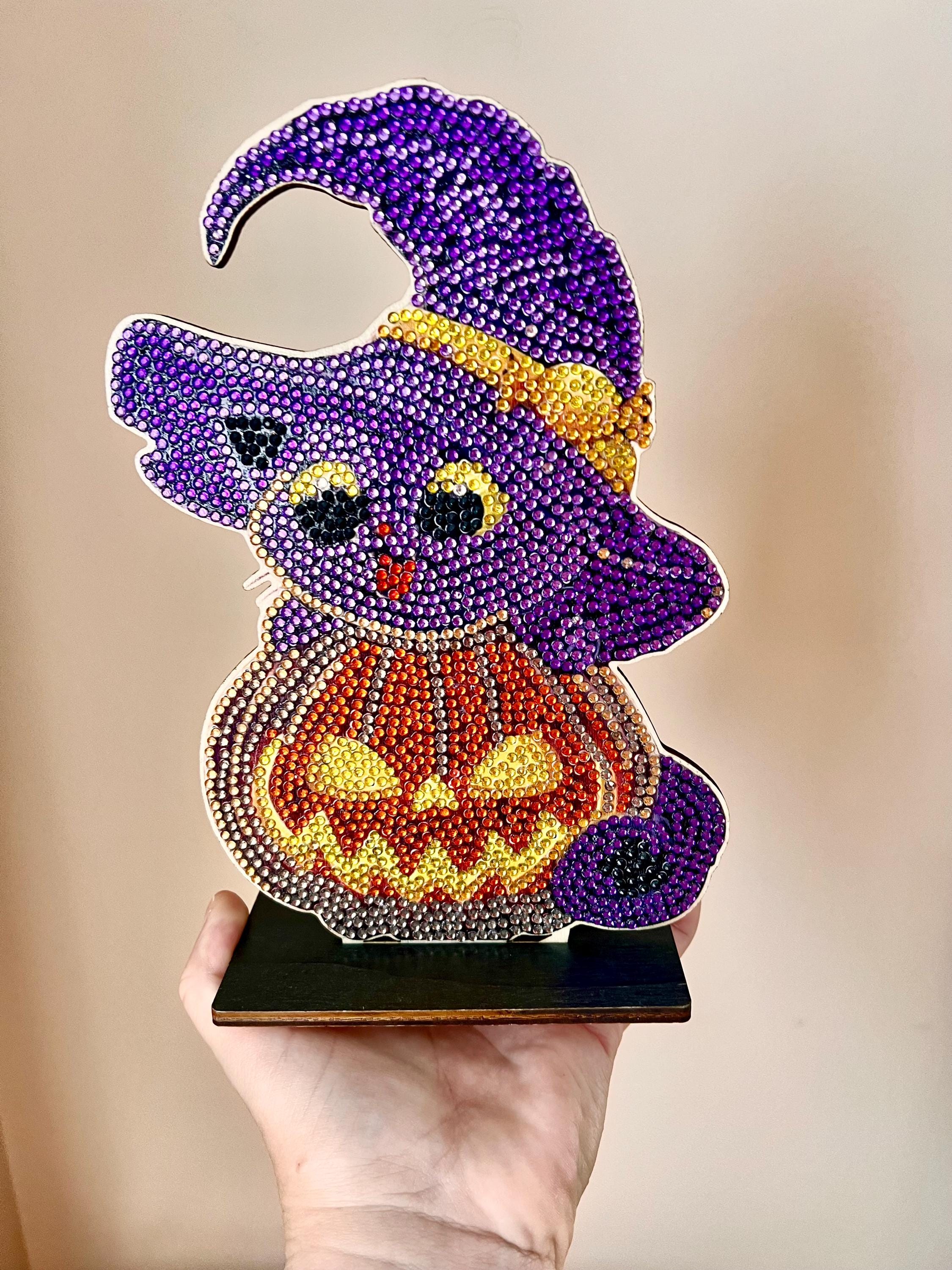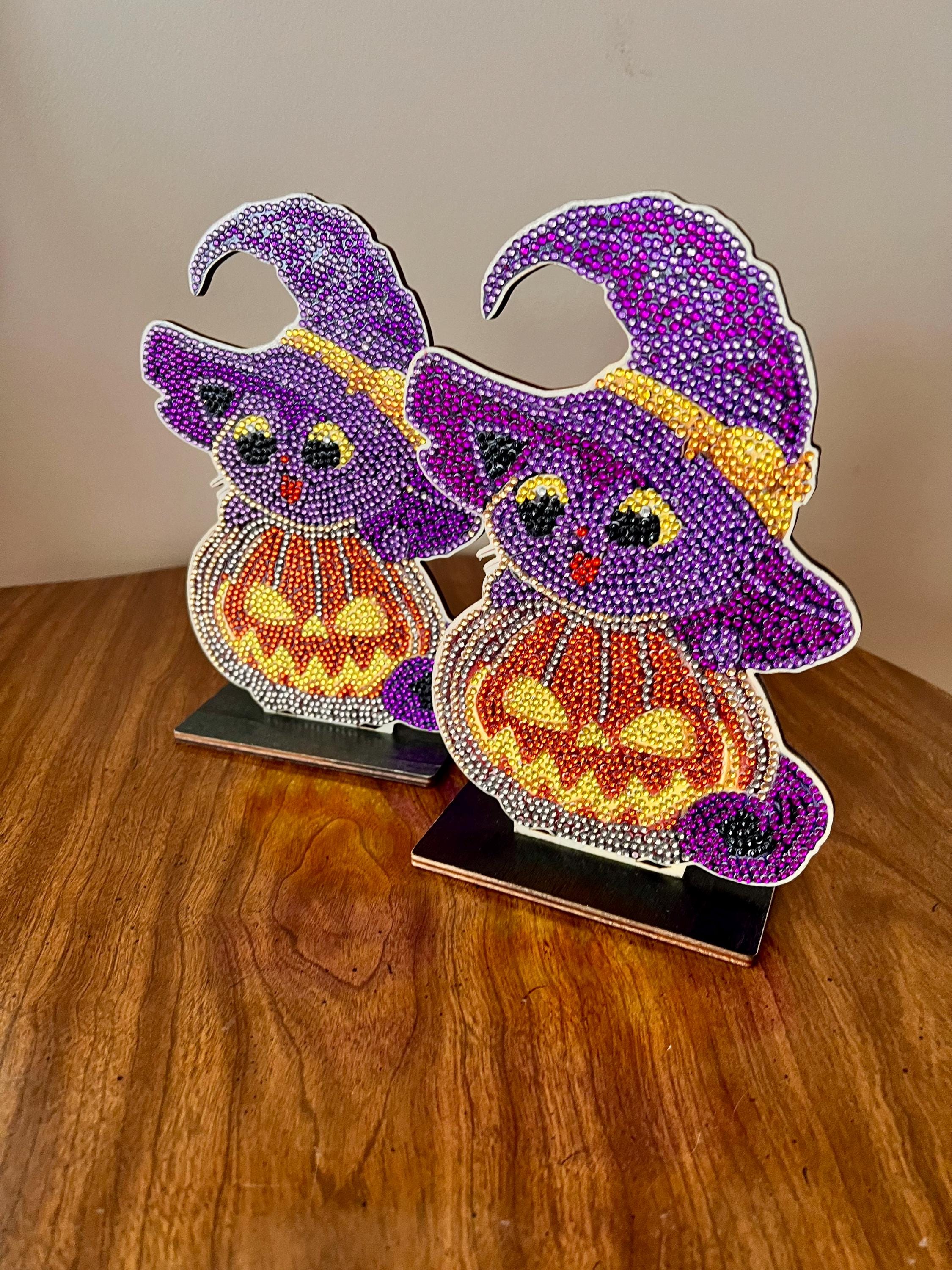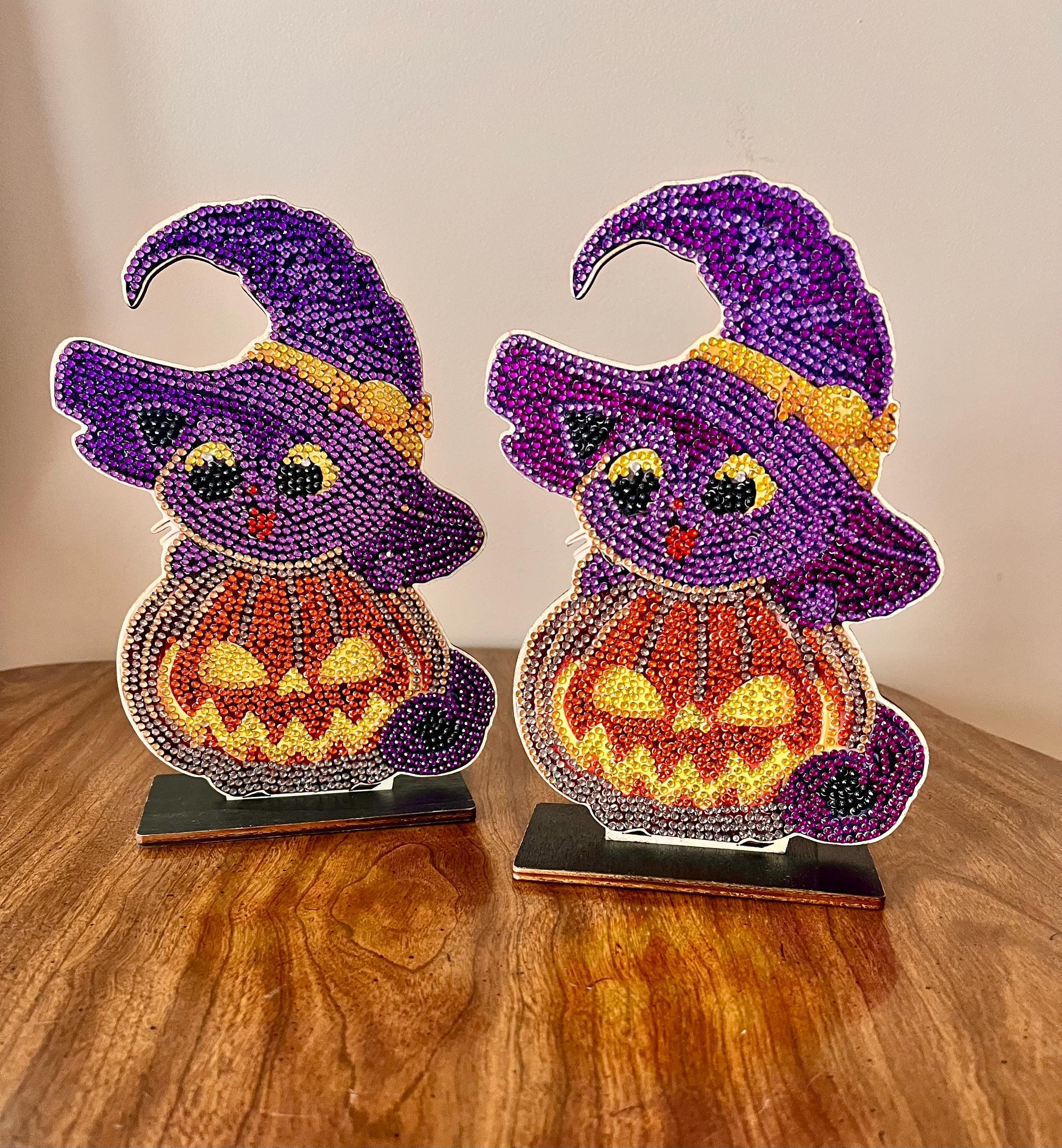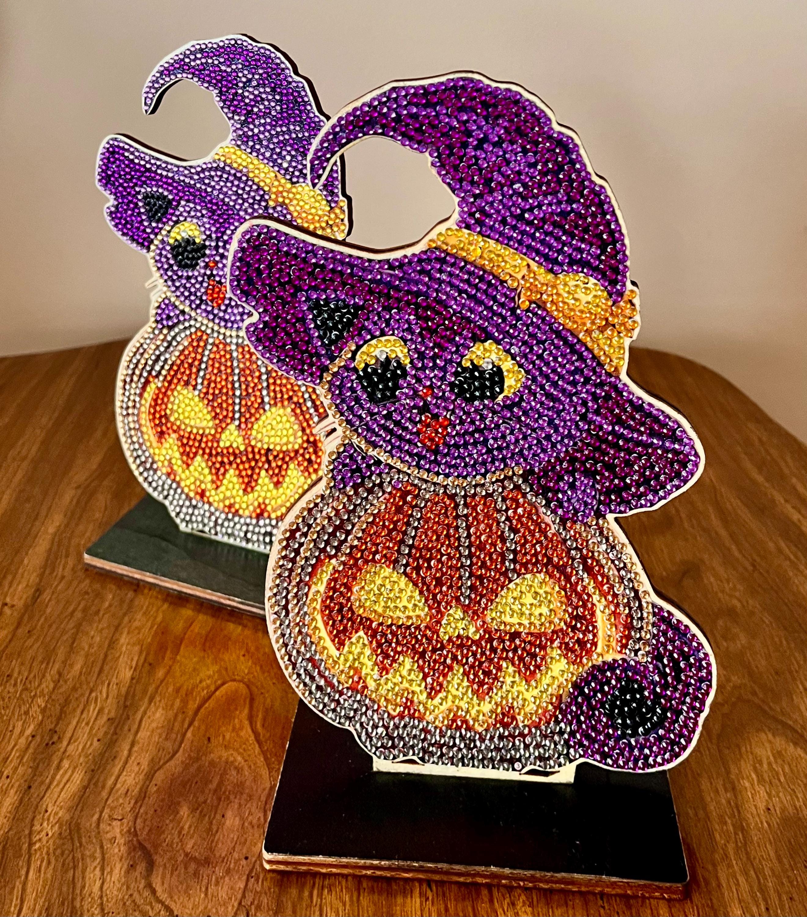 Handmade Witchy Cat Halloween Decor: Purple Beaded Jack O'Lantern Stand