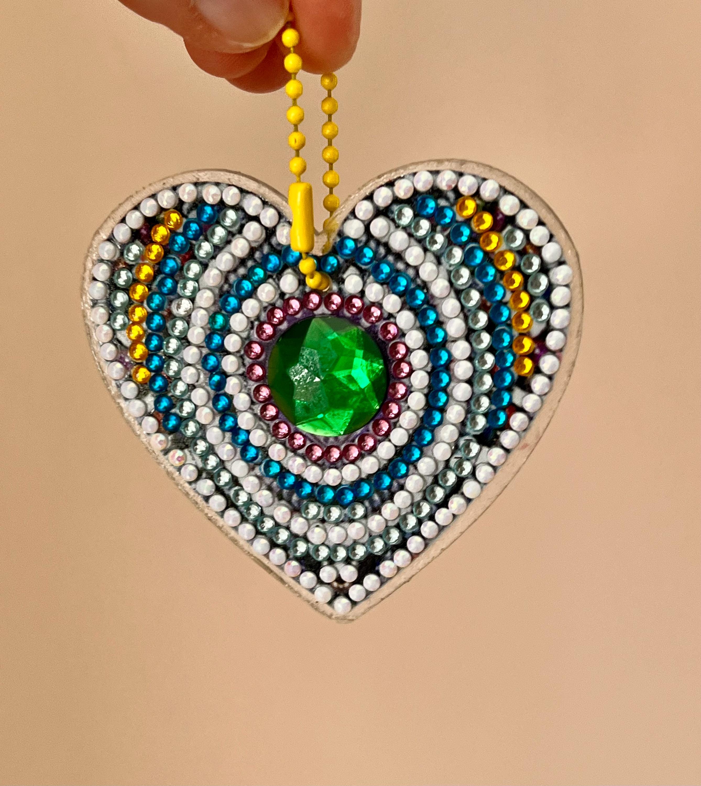 Diamond Art Green Beaded Center Hearts Keychain – Double-Sided Handmade Sparkly Accessory – Sold Individually