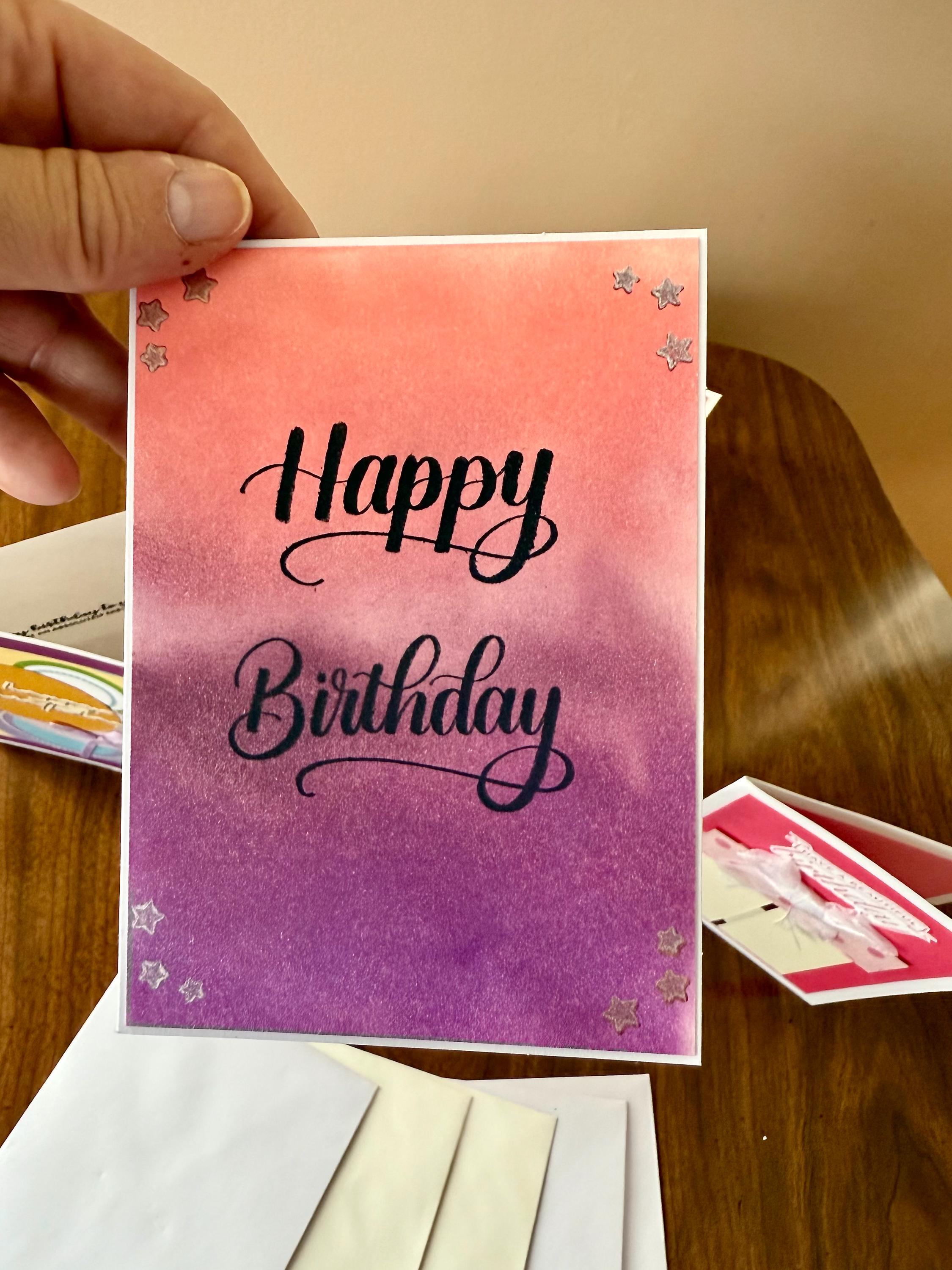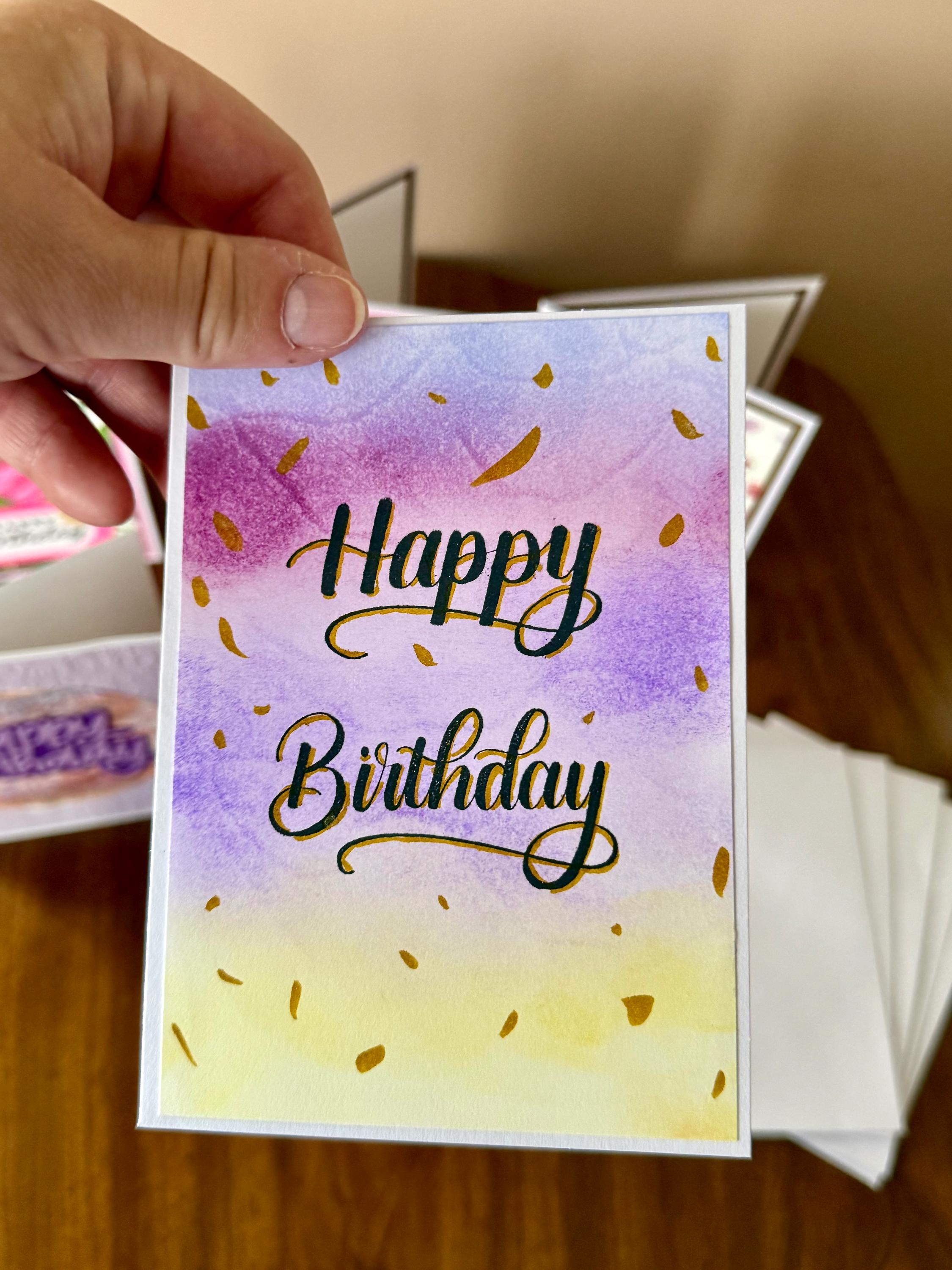 Each card is crafted with care, combining hand-stamped details, embellishments, and quality materials for a memorable birthday greeting.
