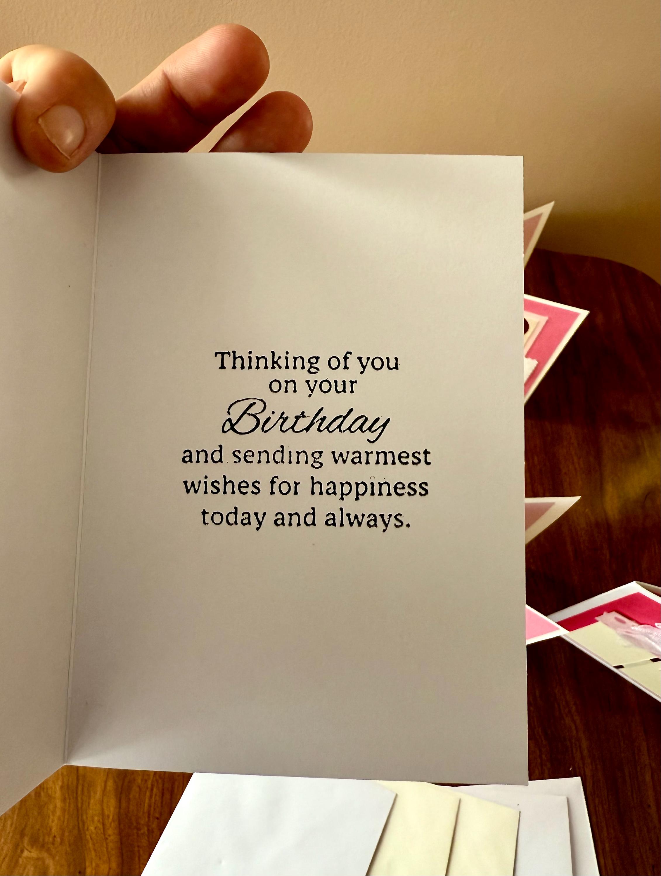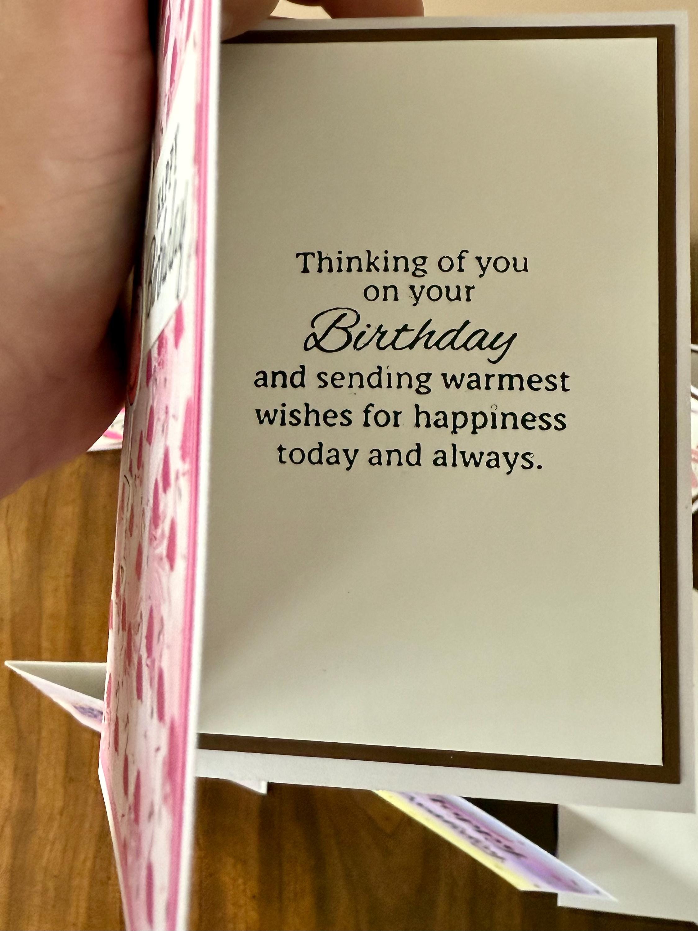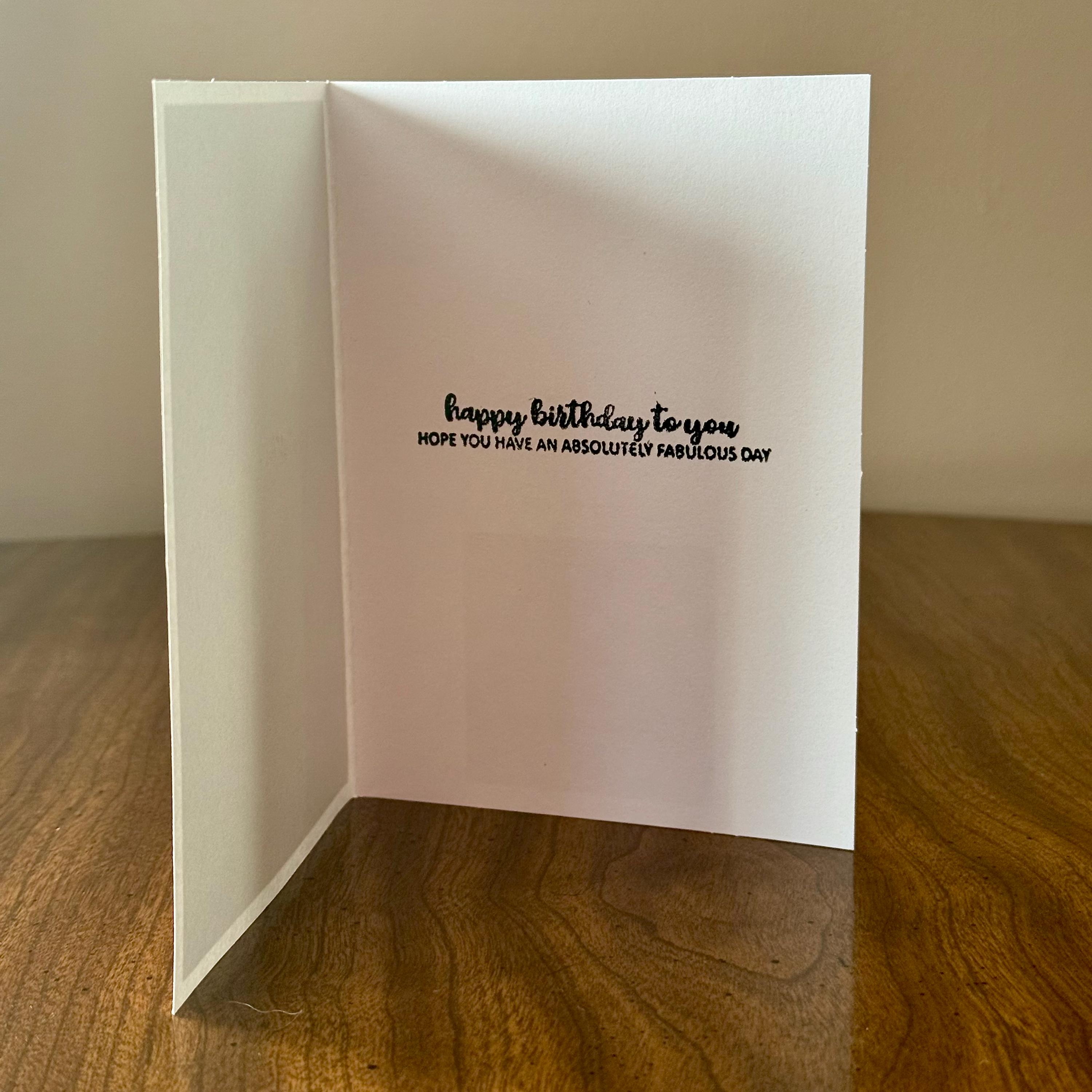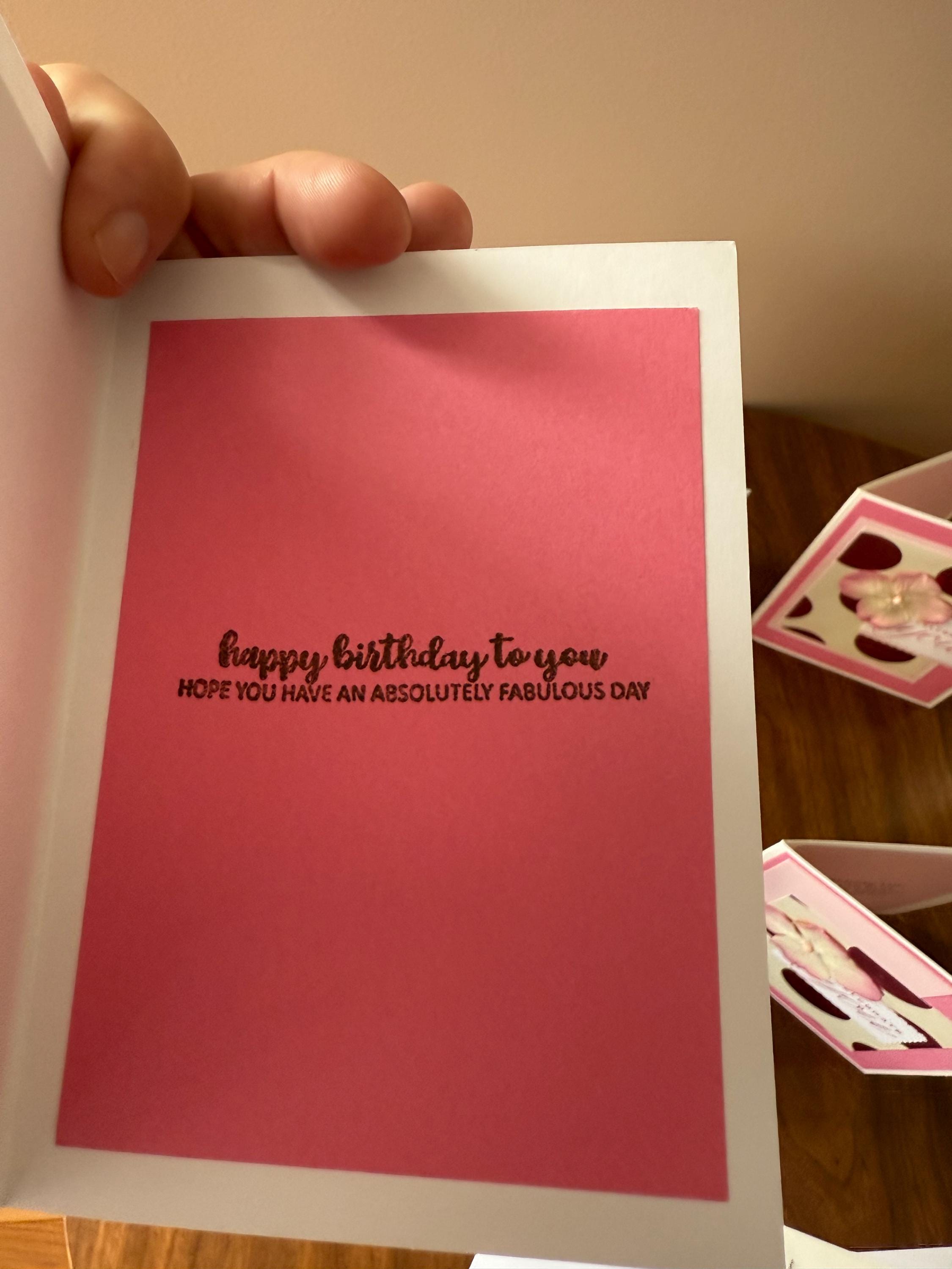 Gift Box with Ribbon – Front stamped “Happy Birthday” in pink; inside: “Happy birthday to you! Hope you have an absolutely fabulous day.”