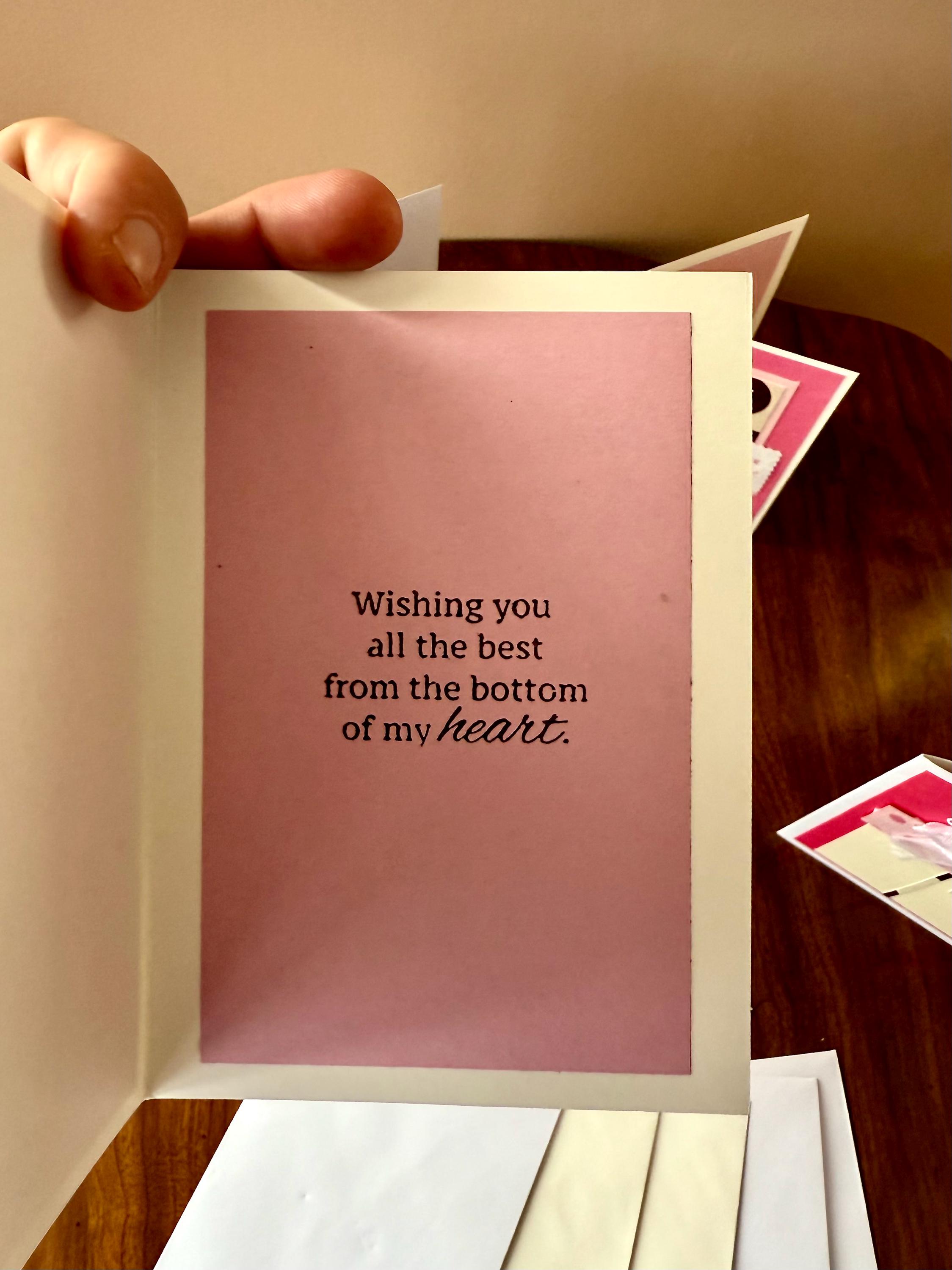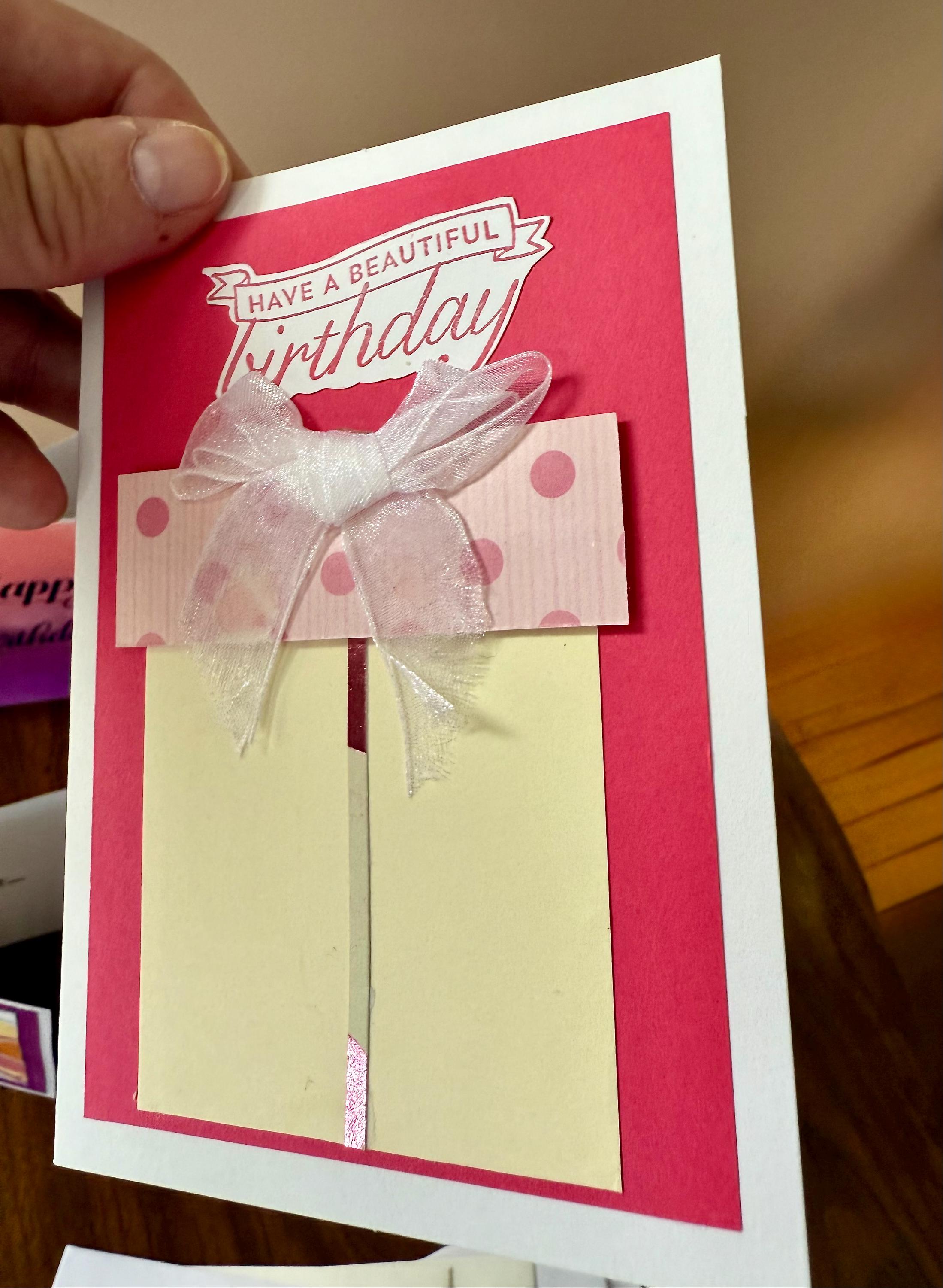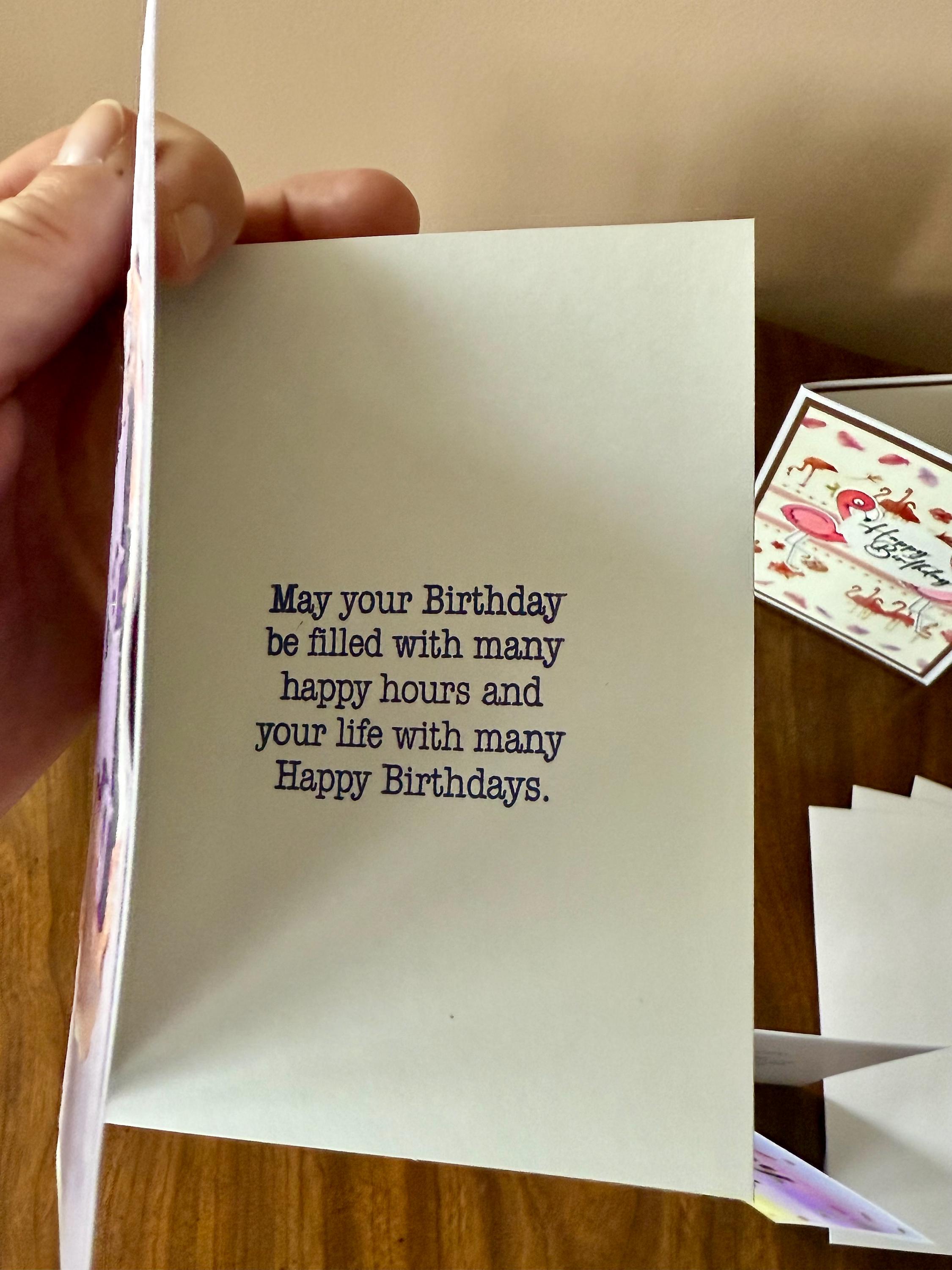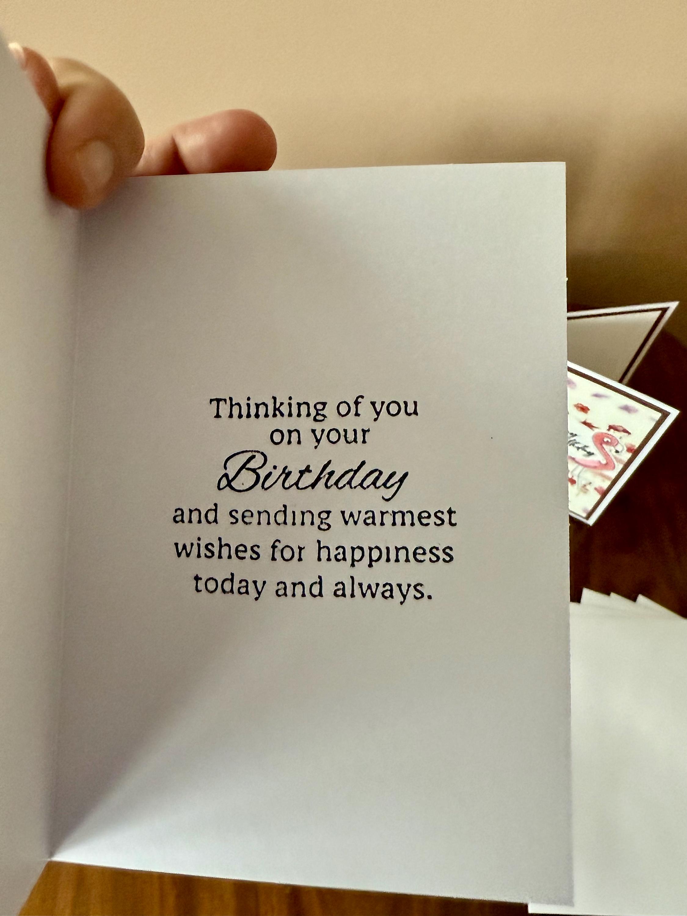 Gift Box with Ribbon – Front stamped “Happy Birthday” in pink; inside: “Happy birthday to you! Hope you have an absolutely fabulous day.”
