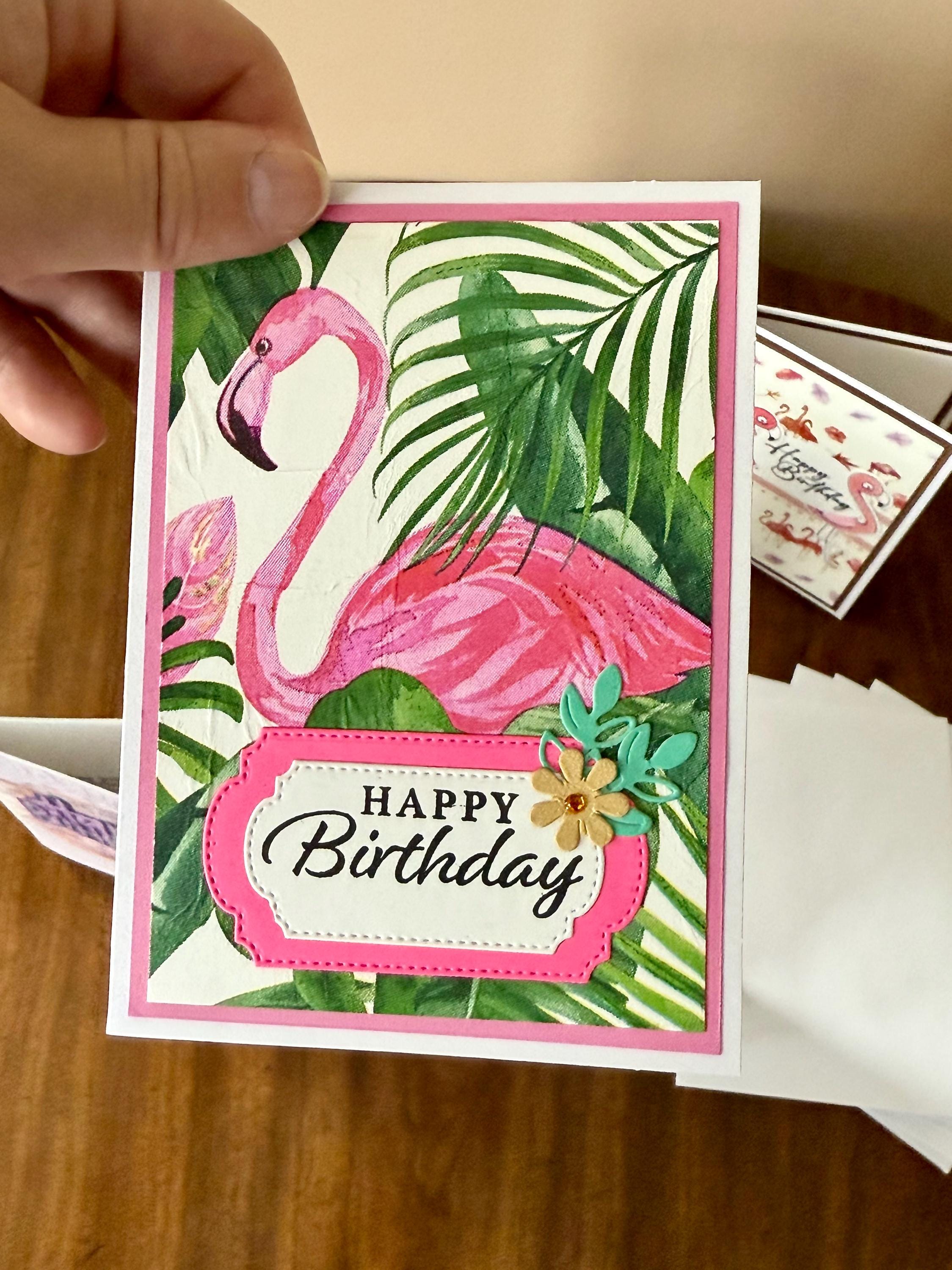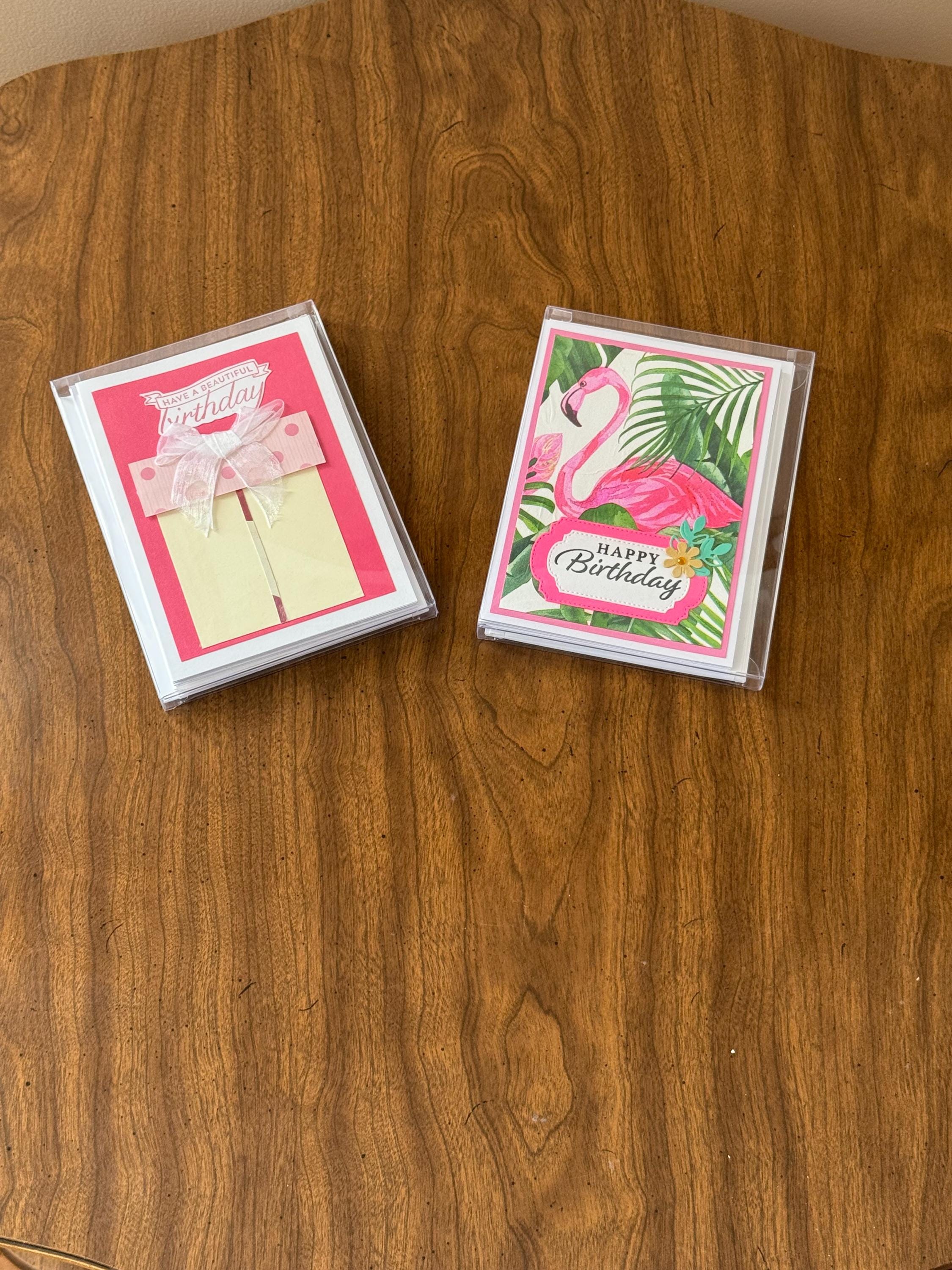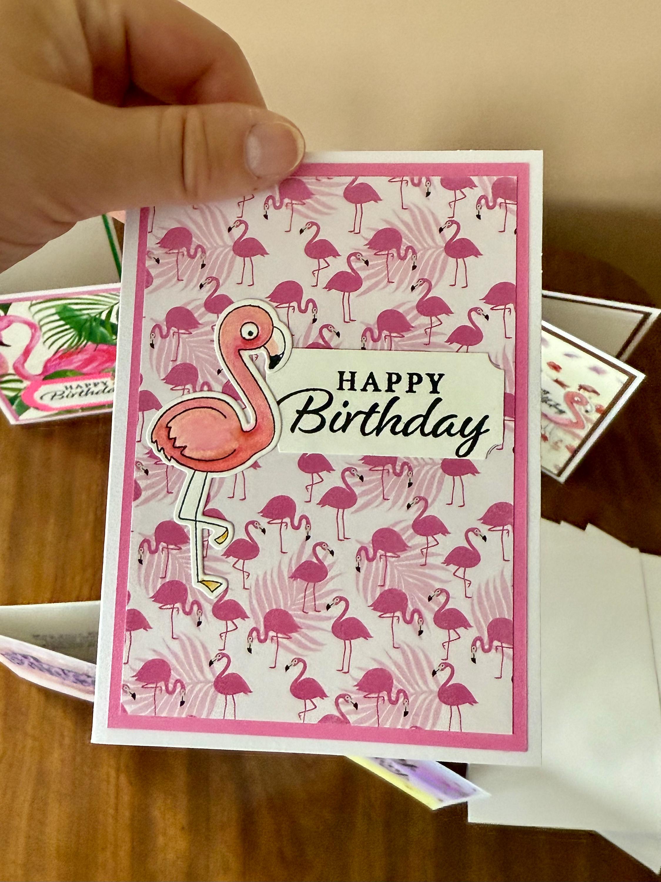 1–3. Flamingo Cards – Hand-colored flamingos; messages include: