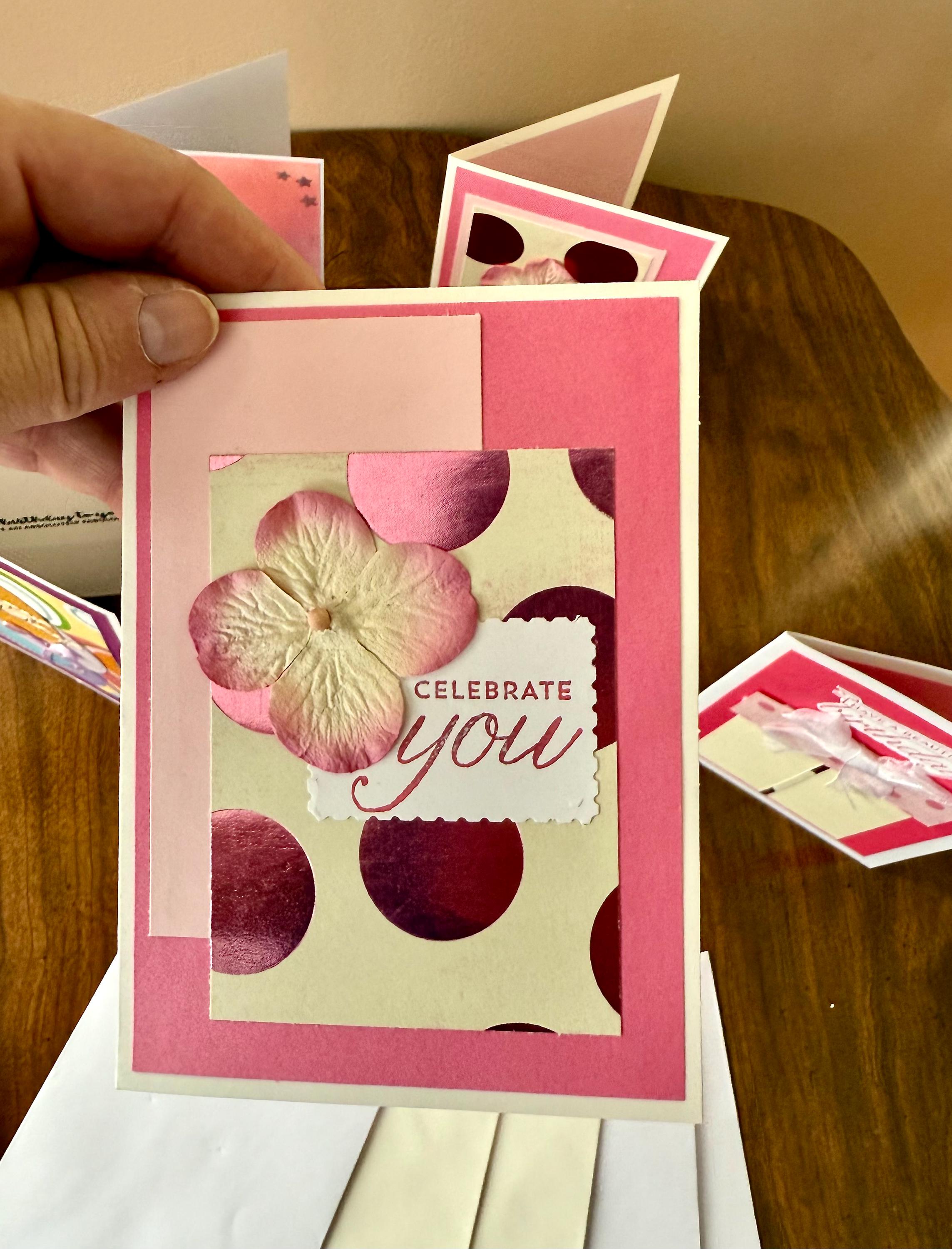Celebrate You Cards – Flower embellishments; inside: “Wishing you all the best from the bottom of my heart.”