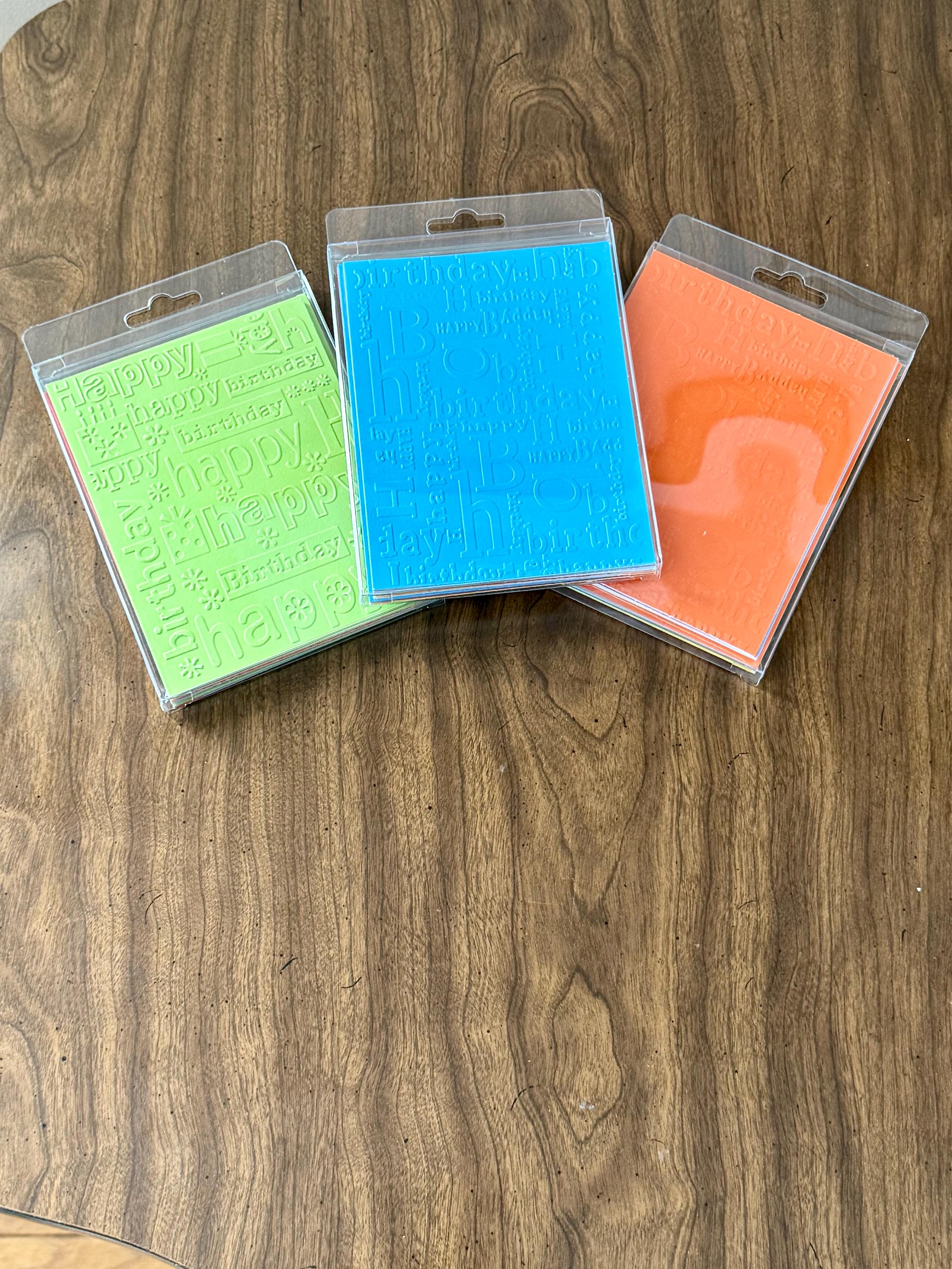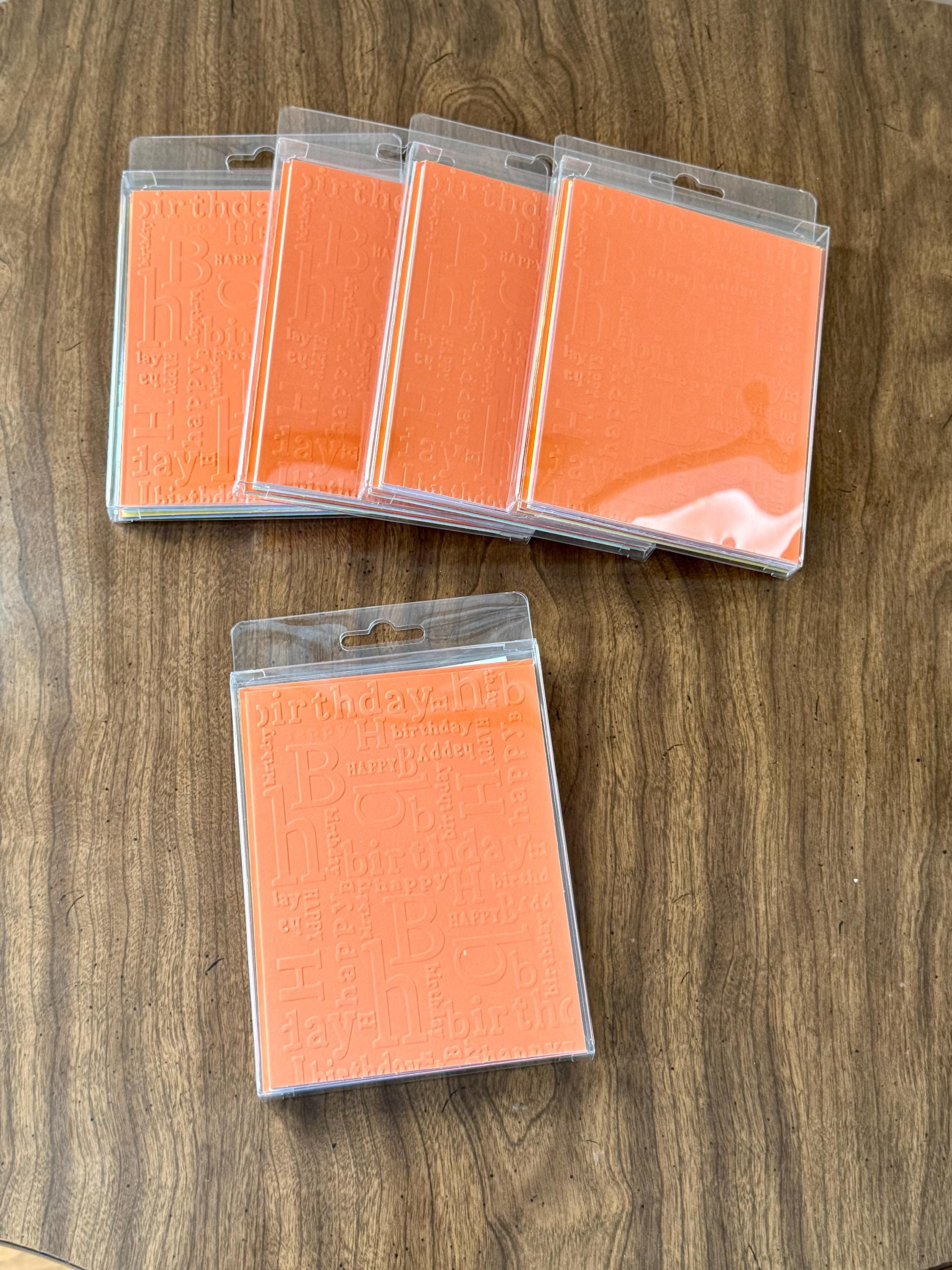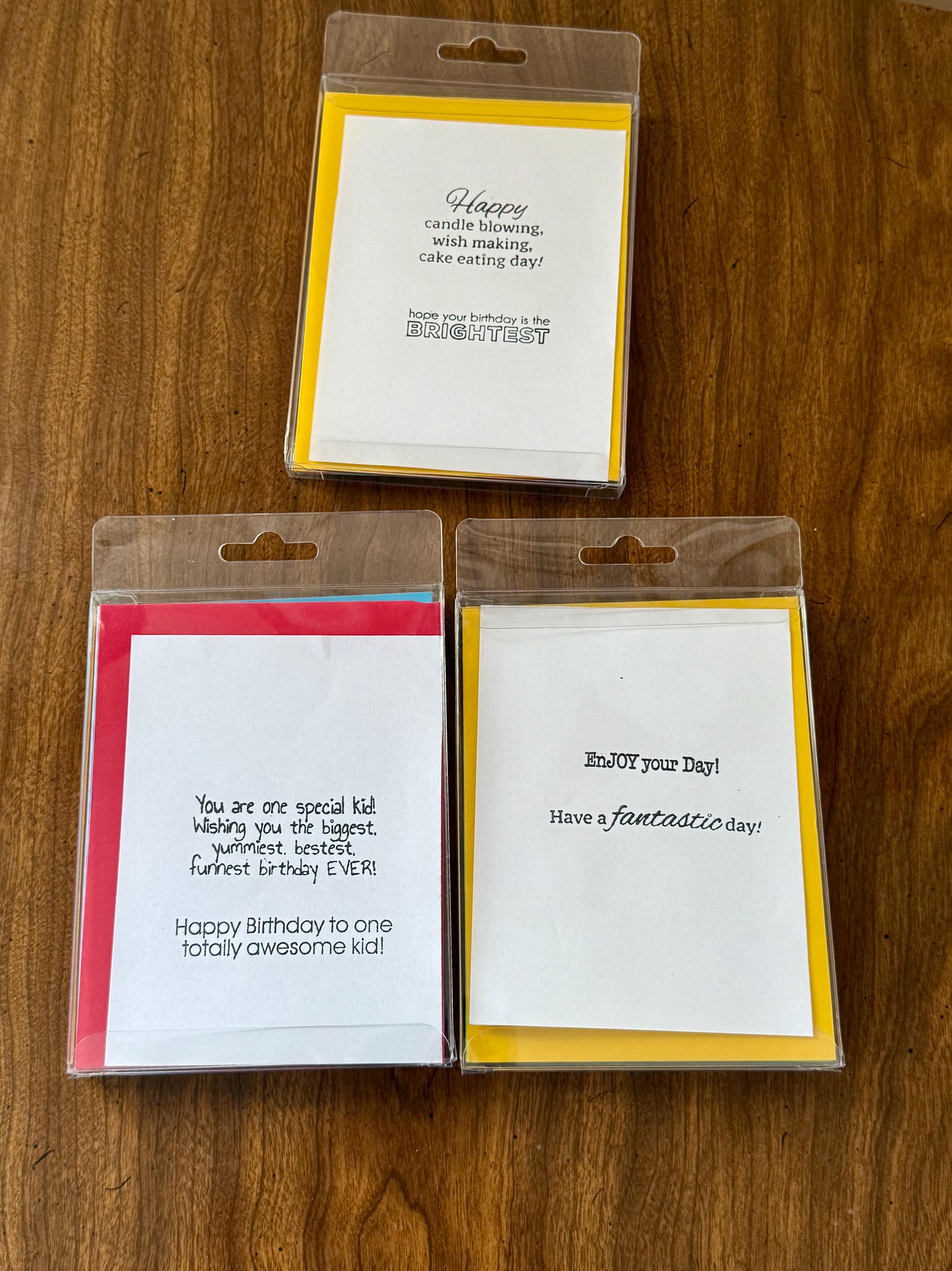 Variety of Embossed Birthday Greetings; messages inside are: Enjoy your day! And Have a Fantastic Day!