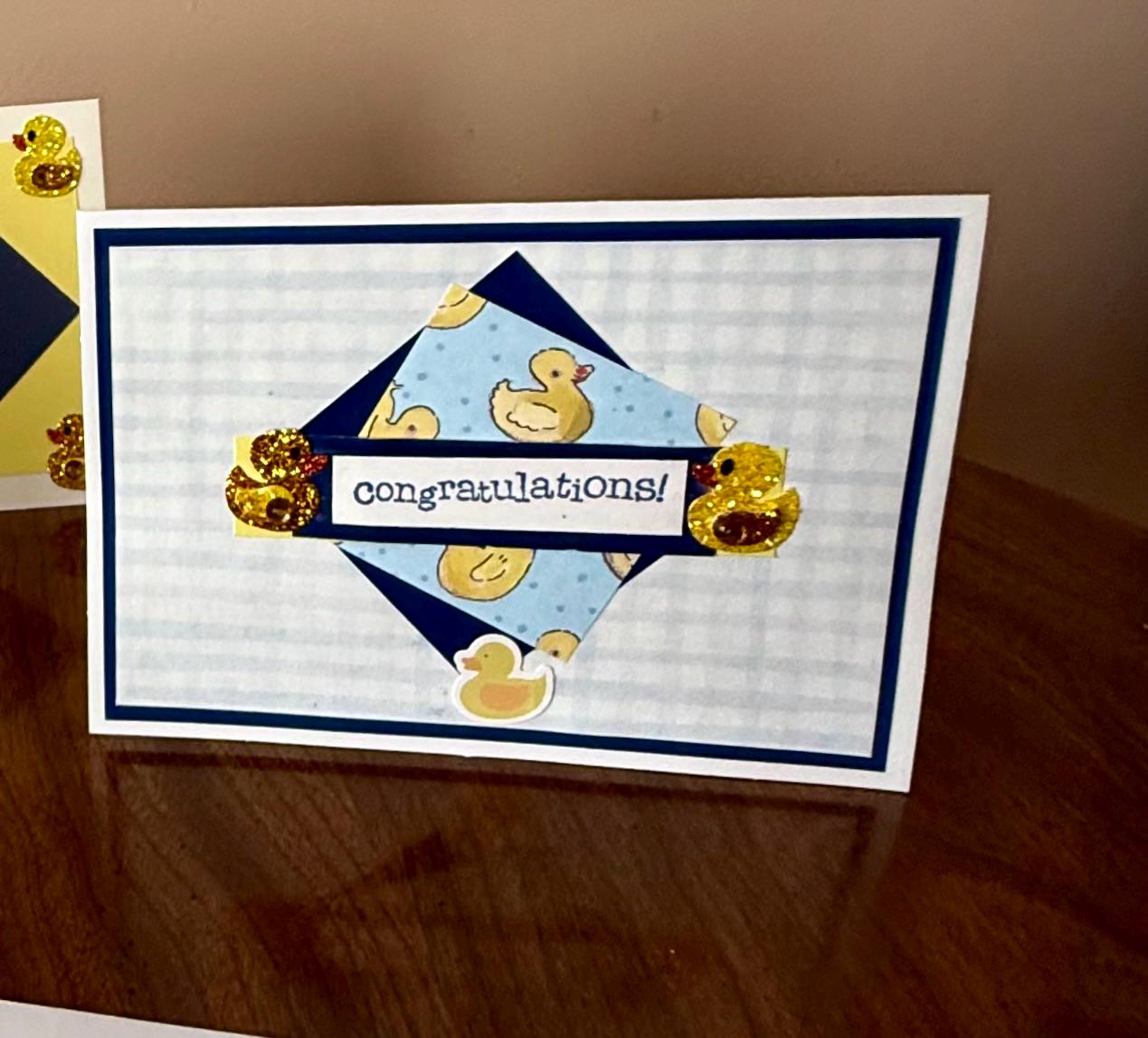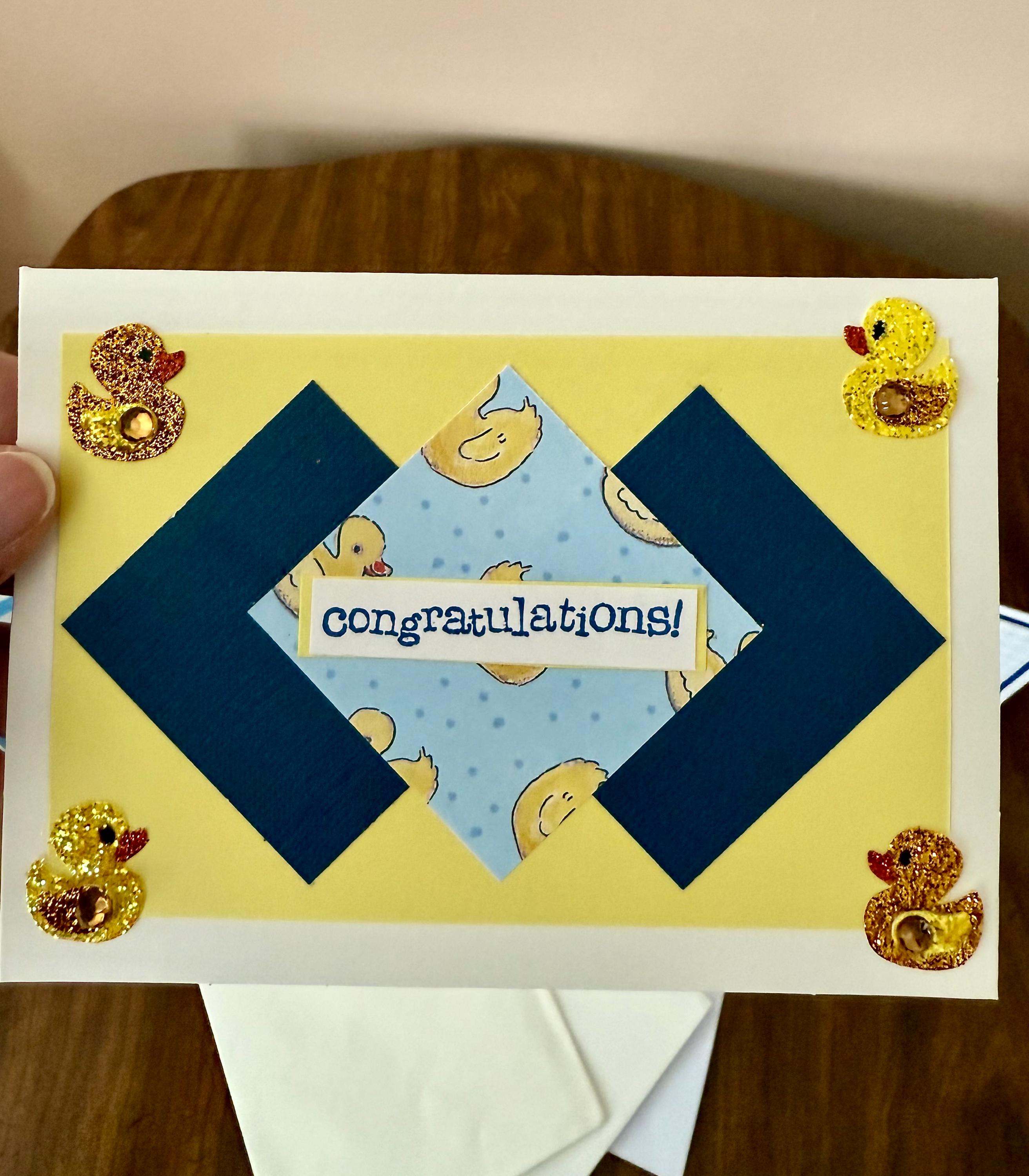 Baby Ducky Card: Four sparkly duckies in the corners with “Congratulations”